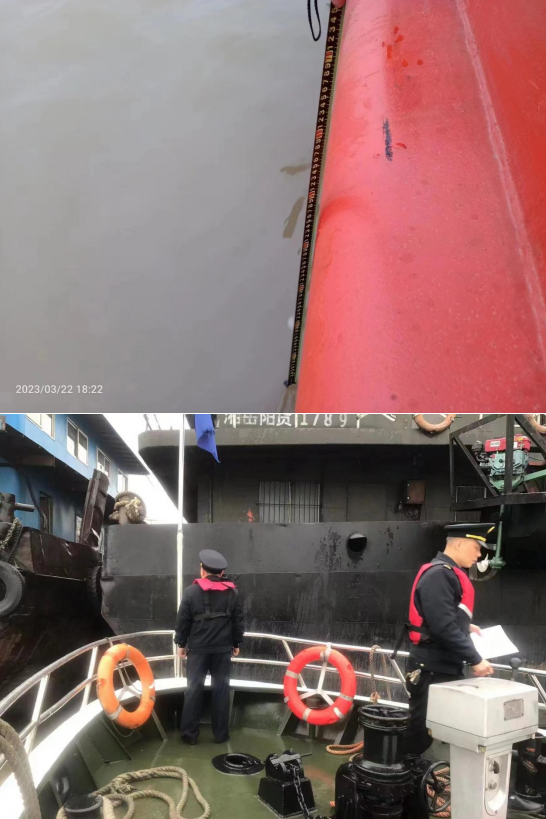 3月22日下午,岳阳市交通运输综合行政执法支队海事行政执法大队在对市中心城区水域运砂船、社会物资船及港口作业船舶开展锚泊秩序专项整治中,执法人员巡查发现兴航油9XX船舶在岳阳楼水域时吃水已经超过核定船舶载重线,涉嫌超核定载重线载运货物。执法人员汤中华、吴新哲、曾繁安登船检测,通过测量载重线,判定该船舶涉嫌超核定载重线载运货物,依法予以立案调查。