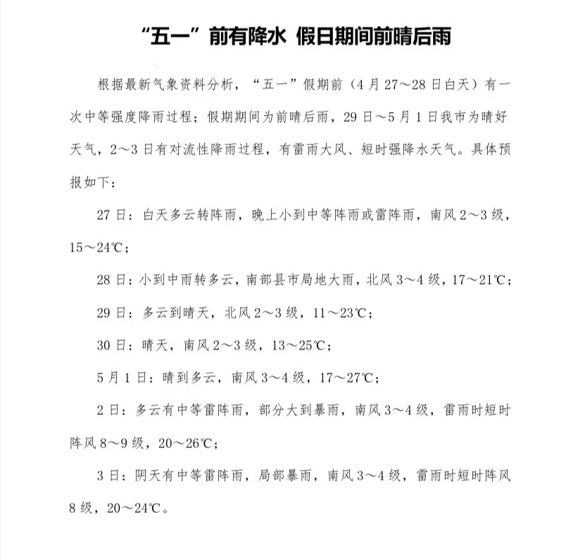 1.重点防范 27 日晚~28 日白天、5 月 2~3 日局地强降水可能诱发的山
