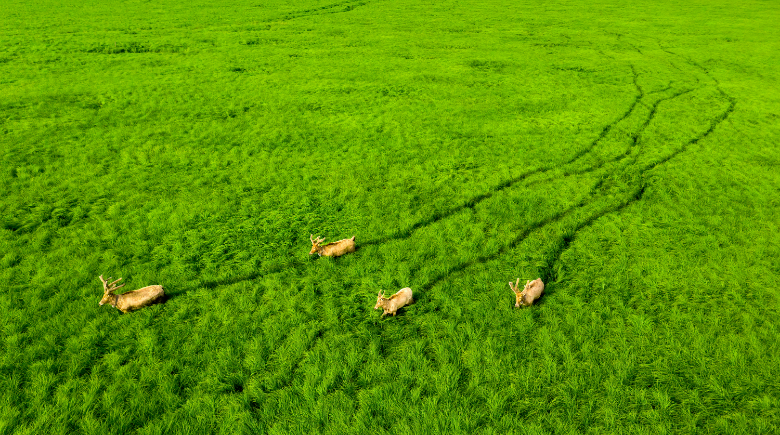 图为岳阳市东洞庭湖湿地里麋鹿奔跑的场景。周立 摄