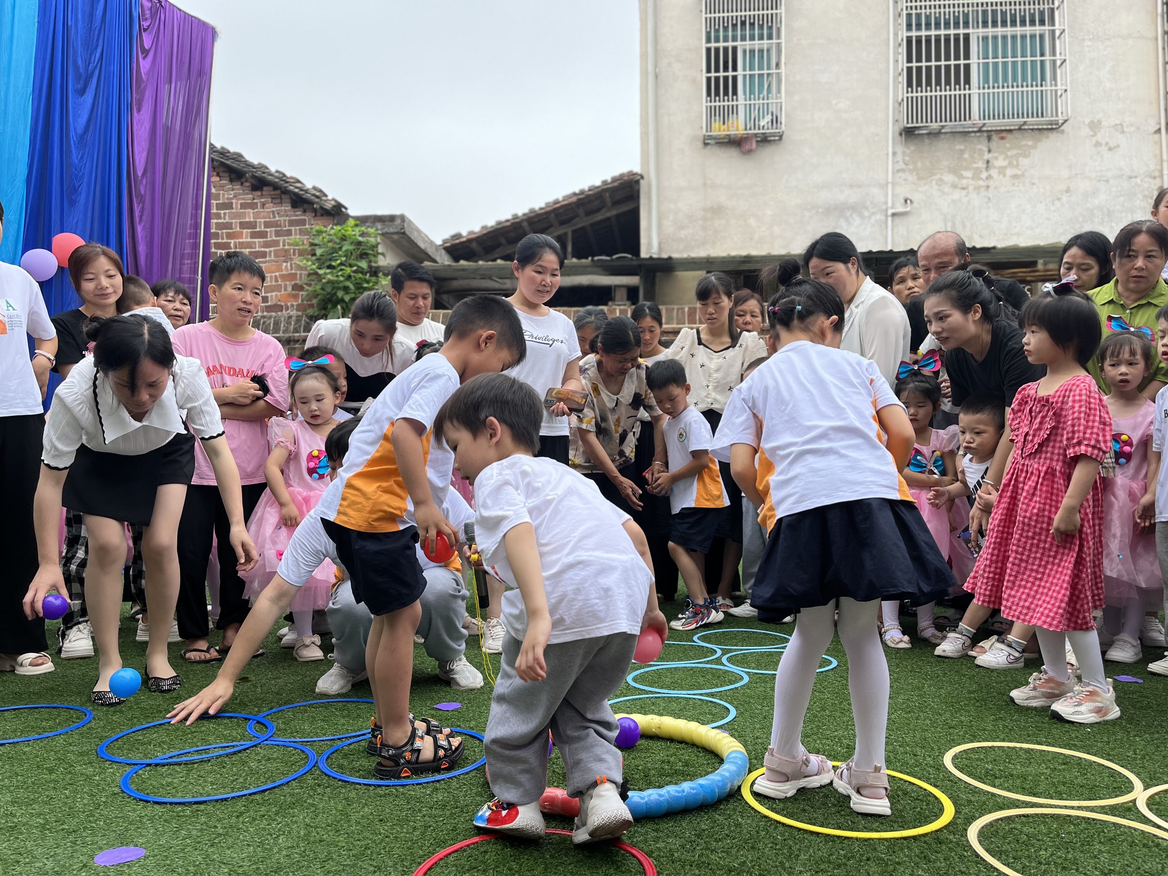 最开心的要数亲子游园会,精彩轮番上演。抢球大战开始啦,4个小组的萌娃们瞪大了眼睛时刻准备着从轮胎当中抢球,谁也不甘落后。1个、2个、3个……音乐止,笑声扬,嘿嘿嘿,绿叶组抢到10个大获全胜。“都说俺老猪肥又壮,你比俺还有分量……”“猪八戒背媳妇“牢牢地扣住了观众的心弦,歌声、笑声、喝彩声交织在一起。眼看着自己落后了,小雅妈妈十分着急,不小心绊着了脚下的圈圈,母子俩摔倒在地,大家笑了,母子俩也笑了。