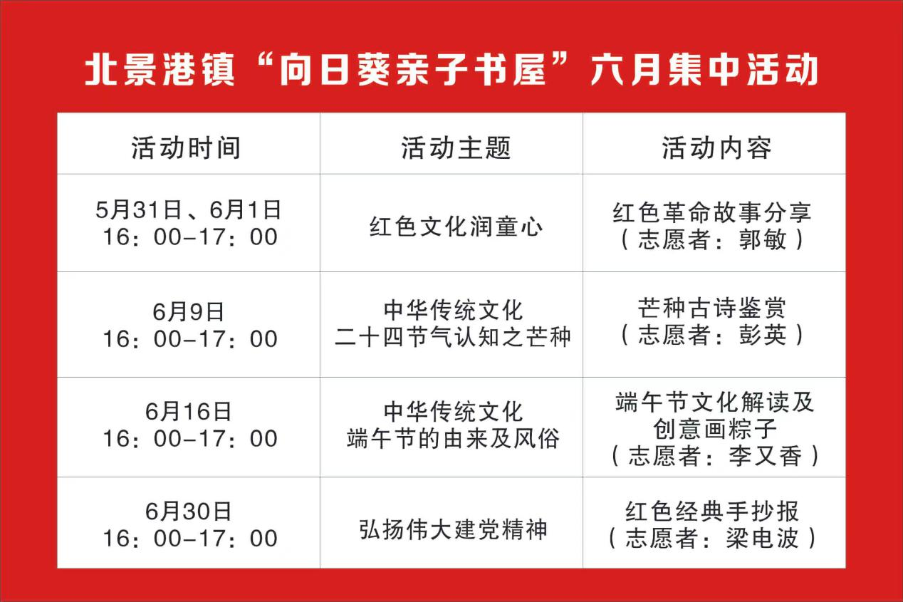 下一步,北景港镇“向日葵”亲子书屋将根据儿童阅读的需要,整合多方力量,以志愿服务为引领,常态化开展“红色革命故事分享”“亲子阅读课堂”“妈妈大讲堂”“亲子手工”等活动,打造集阅读、亲子、娱乐等为一体的适合全年龄段少年儿童学习成长的阅读殿堂。教育引导更多家长重视孩子良好阅读习惯的培养,增进亲子感情,弘扬良好家风,培育向上力量,在全镇营造良好的阅读氛围。