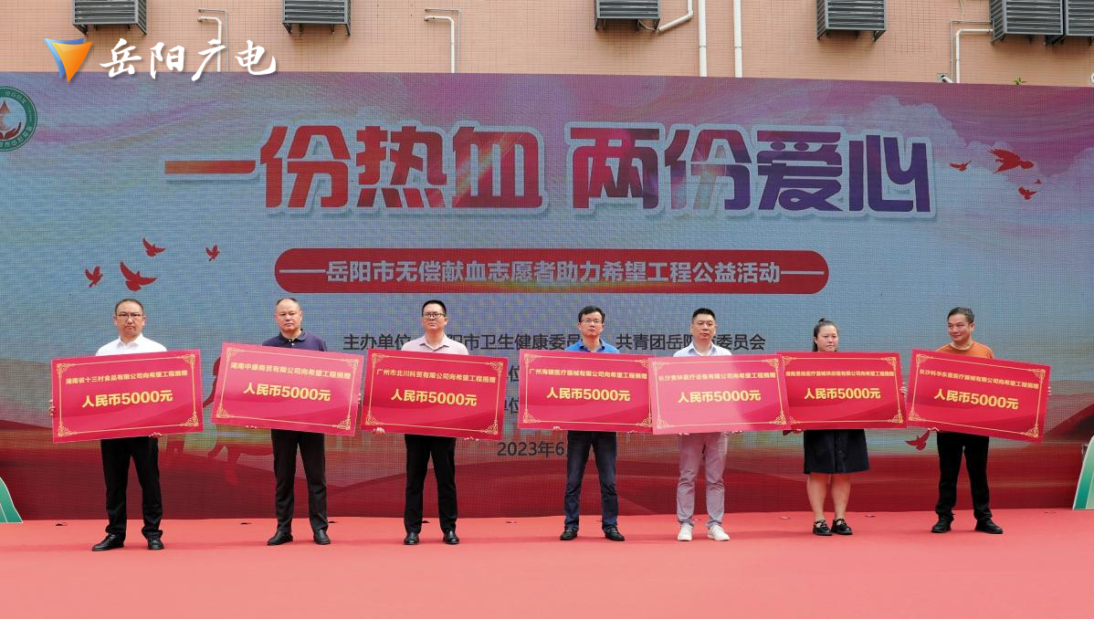 6月14日上午,为庆祝第20个“世界献血者日”,感恩献血者,营造无偿献血良好社会氛围。“一份热血,两份爱心”——岳阳市无偿献血志愿者助力希望工程公益活动正式启动。在2023年6月14日-2024年6月13日期间,每无偿捐献全血一次,岳阳市中心血站将以献血者名义向希望工程捐赠人民币1元,捐献机采成分血一次,向希望工程捐赠人民币2元。诚挚邀请全市广大爱心人士和团体参与冠名捐赠,携手为希望工程助力!