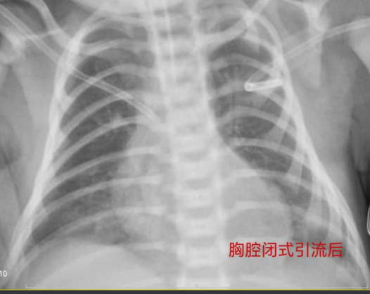 中午12点多,患儿转入新生儿科,许德权副主任带领医护团队,为患儿紧急完善相关检查,确诊为新生儿急性呼吸窘迫综合征并发双侧张力性气胸,遂立即为患儿实施双侧胸腔闭式引流联合高频呼吸机辅助通气。操作顺利完成后,宝宝呼吸困难明显好转,在场的医护人员暂时松了一口气,但他们丝毫不敢懈怠,守护在宝宝身边,时刻关注病情变化。