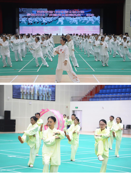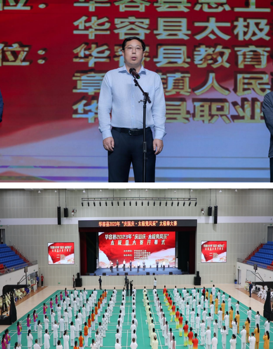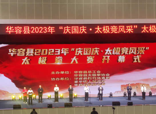 岳阳广电全媒体讯(通讯员 黄志斌)9月24日,华容县2023年“庆国庆·太极竞风采”太极拳大赛在县职业中专体育馆隆重举行。本次大赛由华容县总工会、县太极拳协会主办,县教育体育局、县职业中专、章华镇人民政府协办,旨在发动全县各级工会会员广泛开展全民健身运动,加速推进“健康华容”建设工程,赛出太极拳运动风采,庆祝新中国成立74周年。华容县委书记陶伟军宣布大赛开幕,县委常委、县委办主任、县总工会主席胡军主持开幕式,县委常委、副县长涂娟致辞,县人大常委会主任李学松,县政协主席张大宏,县人常委会副主任张昭林、副县长陈飞、县政协副主席文丽萍等领导出席。