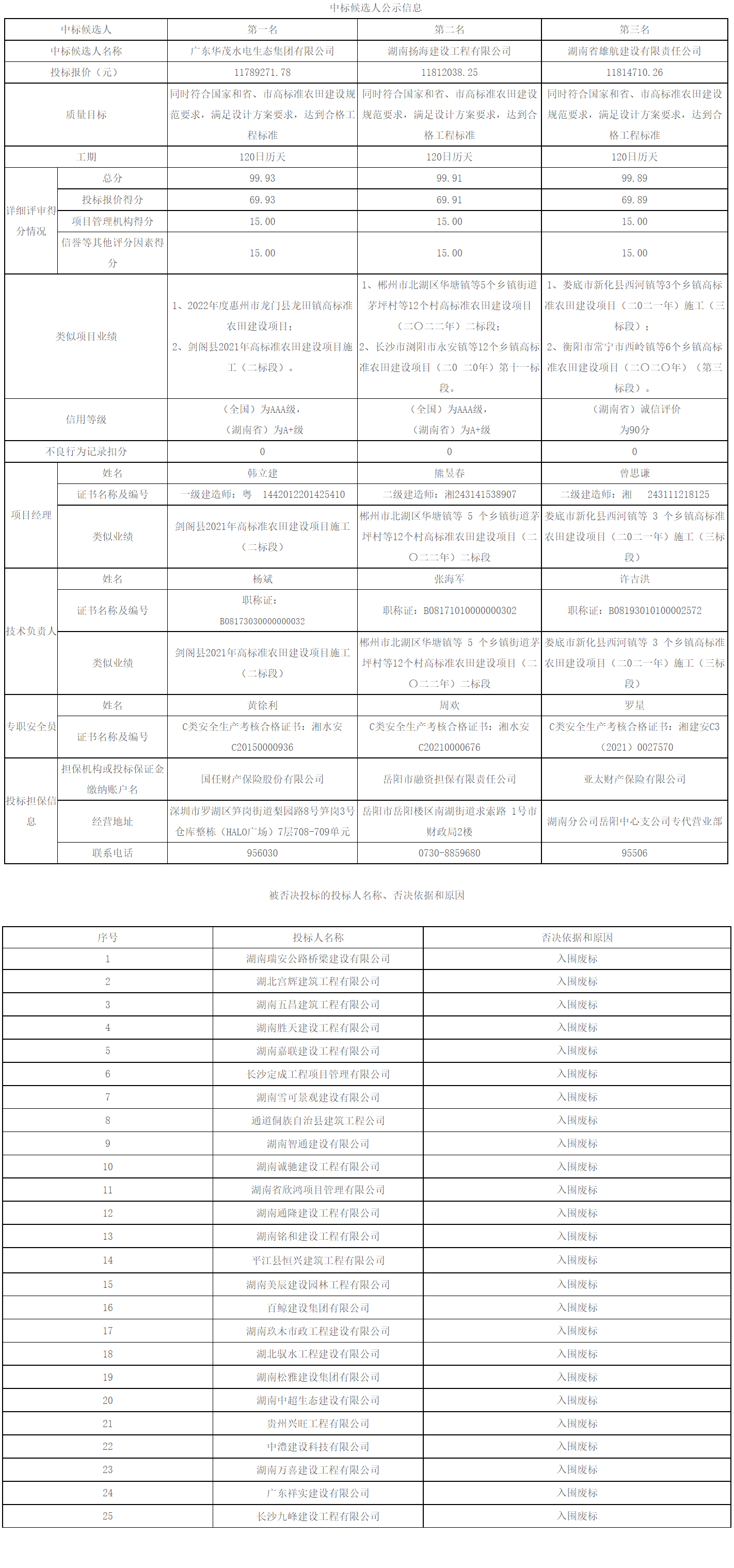 湖南龙科项目管理有限公司受岳阳县农田建设服务中心的委托,代理岳阳市岳阳县2023年高标准农田建设项目(第1标段)工程施工招标,2023年10月25日(北京时间)在岳阳市公共资源交易中心进行了公开开标,在岳阳县农业农村局、岳阳县招标投标综合管监督下,依法组建的评标委员会按照招标文件确定的评标原则和评标办法进行了细致的评审,并推荐本项目中标候选人(排序)排名如下:
