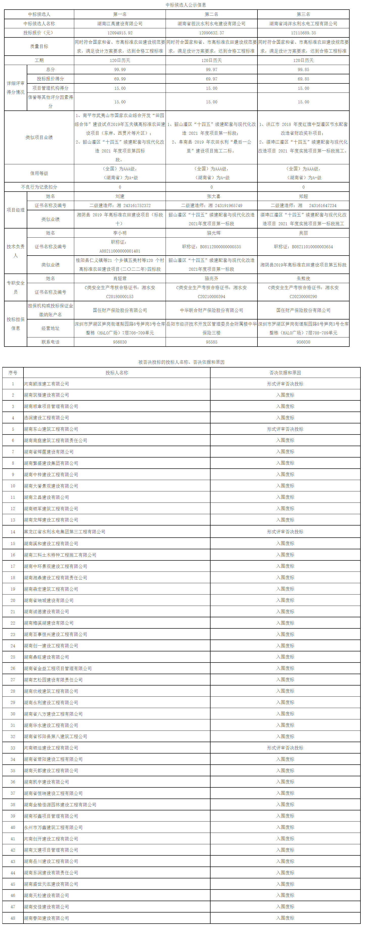 公示期:2023年10月27日始至2023年11月1日17时止(北京时间)。公示期间,投标人和其他利害关系人如有异议,应按照《工程建设项目招标投标活动投诉处理办法》、《关于印发<湖南省招标投标活动投诉处理办法>的通知》(湘发改法规〔2019〕294号)提出异议或投诉。公示期届满时,对以上中标候选人若无异议,招标人即确定排名第一名的中标候选人为中标人。