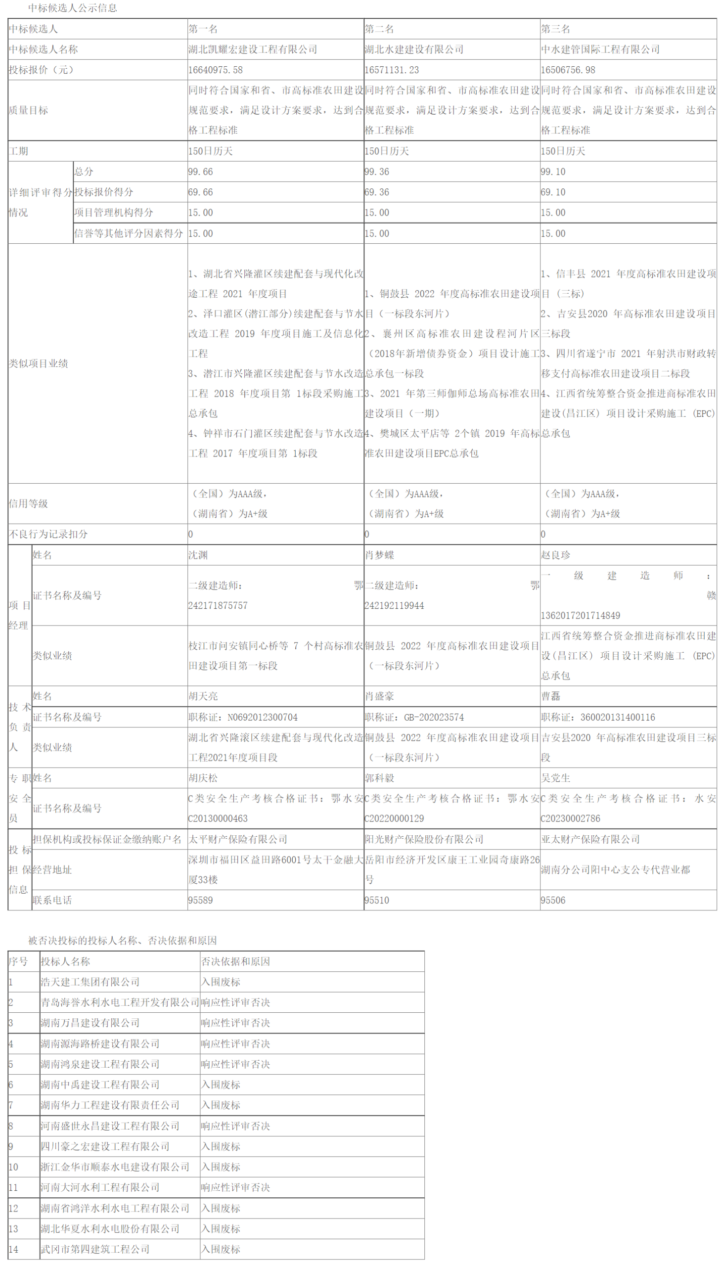 湖南龙科项目管理有限公司受华容县农业农村局的委托,代理华容县2023年高标准农田建设项目(2标段)工程施工招标,2023年10月25日(北京时间)在岳阳市公共资源交易中心进行了公开开标,在岳阳市农业农村局监督下,依法组建的评标委员会按照招标文件确定的评标原则和评标办法进行了细致的评审,并推荐本项目中标候选人(排序)排名如下: