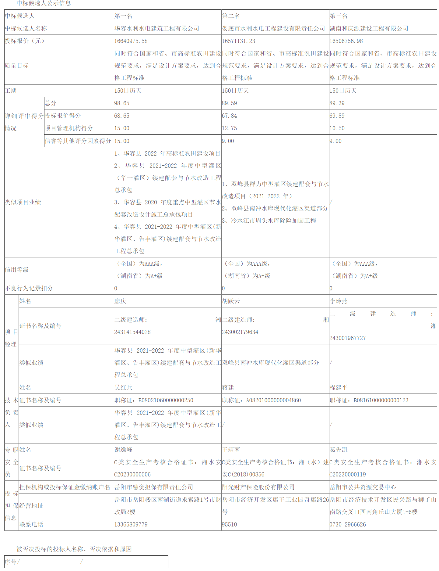 湖南龙科项目管理有限公司受华容县农业农村局的委托,代理华容县2023年高标准农田建设项目(3标段)工程施工招标,2023年10月25日(北京时间)在岳阳市公共资源交易中心进行了公开开标,在岳阳市农业农村局监督下,依法组建的评标委员会按照招标文件确定的评标原则和评标办法进行了细致的评审,并推荐本项目中标候选人(排序)排名如下: