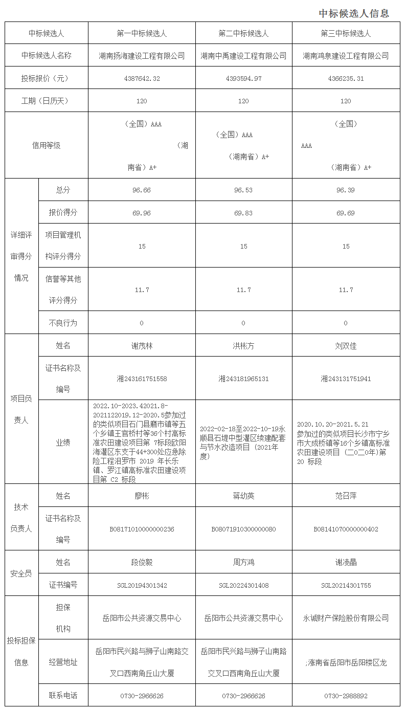 根据招标投标相关法律法规及招标文件的规定,湘阴县2023年高标准农田项目(9标段)于2023年10月17日在湖南省招标投标监管网和岳阳市公共资源交易中心网发布了中标候选人公示,原公示期内收到质疑。2023年10月23日在湖南省招投标监管网和岳阳市公共资源交易中心网发布暂停公告。经招标人同意并报请行政监督主管部门批准,2023年11月06日在岳阳市公共资源交易中心组织项目原评标委员会对该项目评标有关问题予以纠正,现将结果予以公示,公示期2023年11月08日至2023月11月13日。