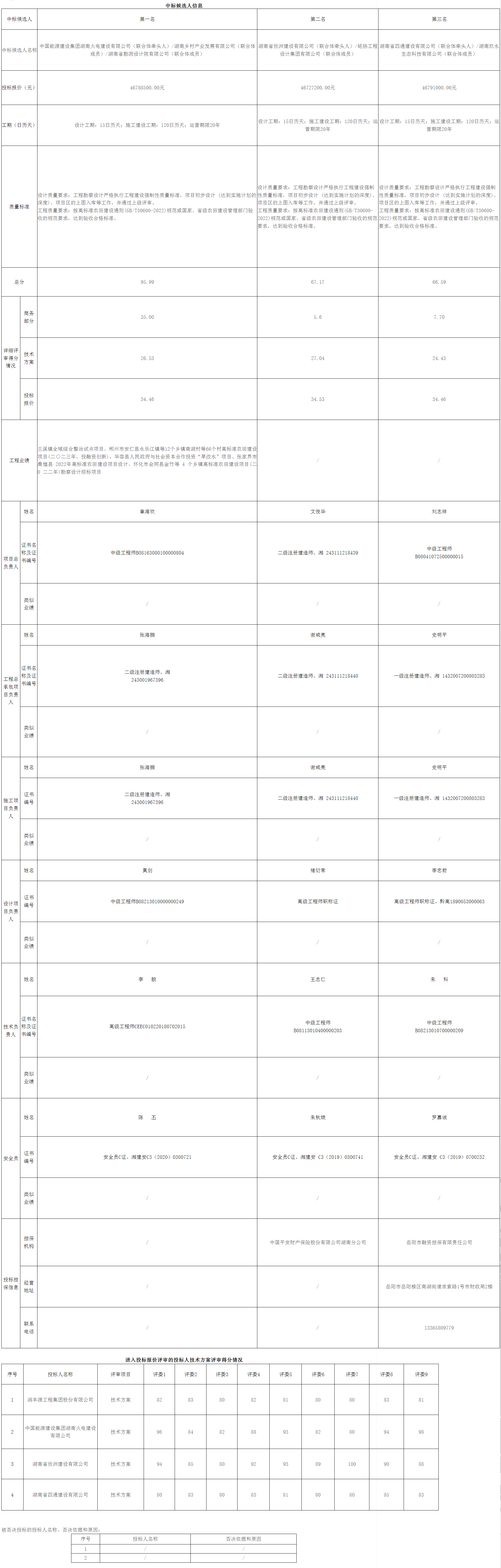 根据招标投标相关法律法规及招标文件的规定,岳阳县步仙镇高标准农田建设投贷联动投融资创新项目(F+EPC+O)评标工作已经结束,本项目采用综合评估法的评标办法,评标委员会推荐了以下3名中标候选人(排序),现将相关信息予以公示。公示期2023年12月20日至2023年12月25日。
