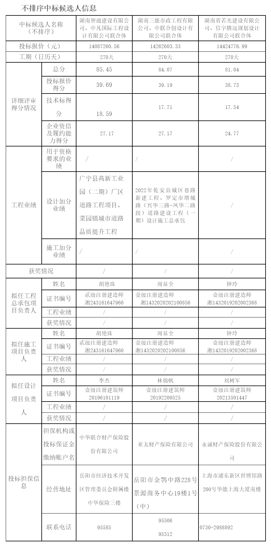 根据招标投标相关法律法规及招标文件的规定平江县水沙坪棚户区改造配套基础设施建设项目(浏家滩路)工程总承包评标工作已经结束,本项目采用综合评估法的评标办法,评标委员会推荐了以下3名不排序的中标候选人,现将相关信息予以公示。公示期2024年1月4日至2024年1月9日。