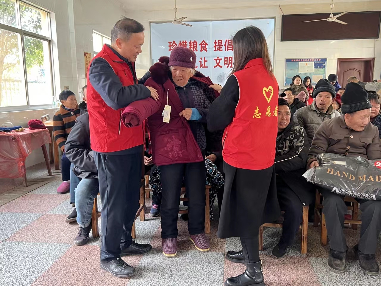 “蛮合身,不大不小”,“穿着热乎,还有毛领”,“谢谢你们,谢谢志愿者”。活动现场,志愿者们俩人一组,在院工作人员的帮助下,为50多位老人穿上了为他们量身定做的崭新棉袄,老人们个个喜笑颜开,连声说感谢。“寒冬送棉袄,穿在身上,暖在心里,县委办的志愿者真是想得周到,托了党和政府的福!”89岁高龄的徐娭毑哽咽着说。