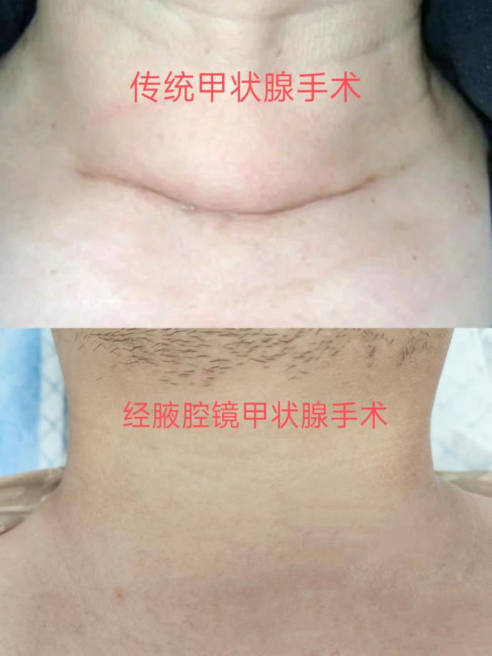 该术式最大的优点是颈部不会留下难看的“自杀式”疤痕,仅在腋窝皱壁有3处5—10mm的切口,愈合后几乎不可见,手术安全,借助超清腹腔镜的放大效应,可以清晰的显露和保护喉返神经及甲状旁腺;手术时间短,仅用80分钟完成手术,省去了传统手术的缝合和拆线,患者术后五天痊愈出院。