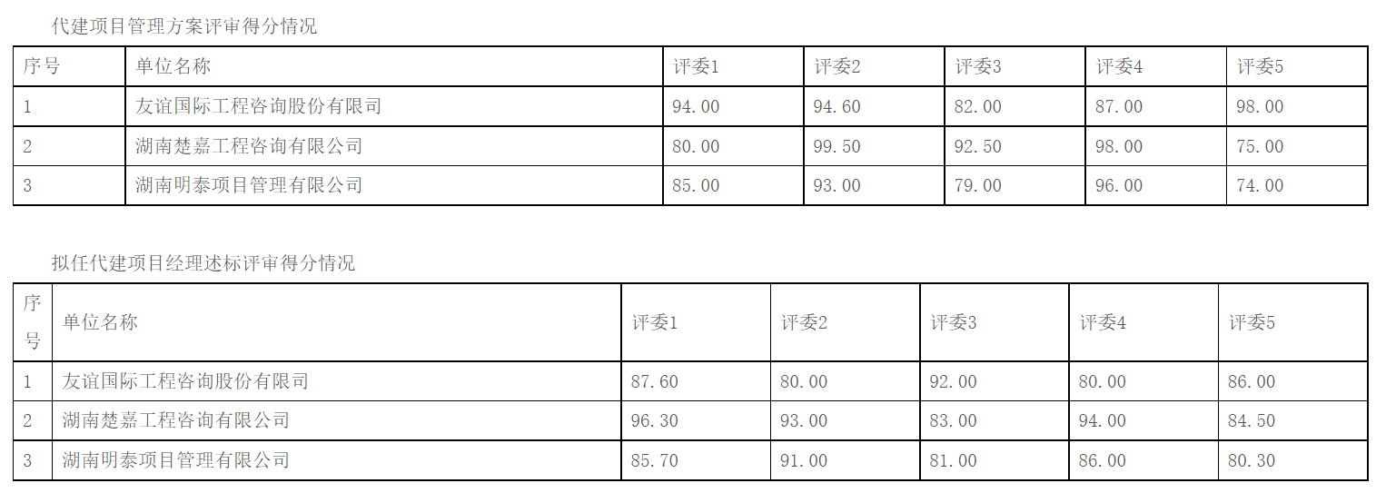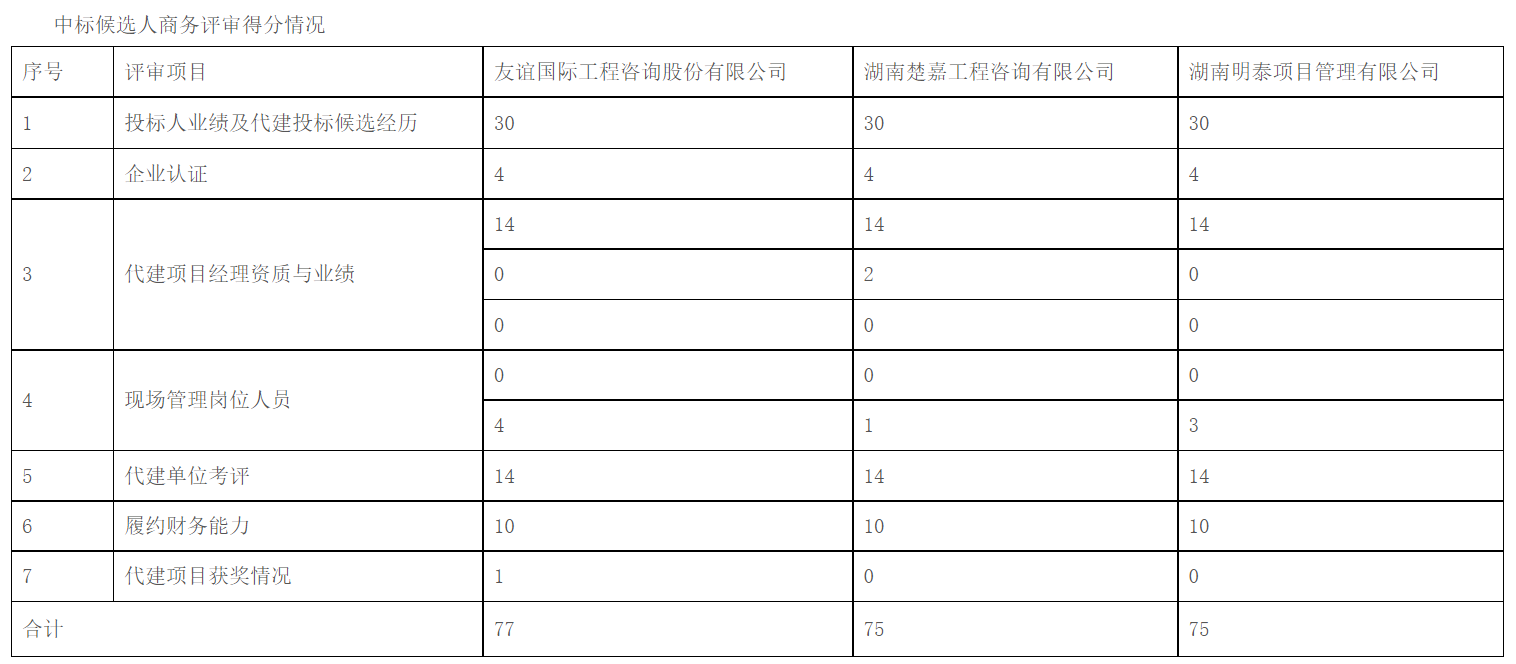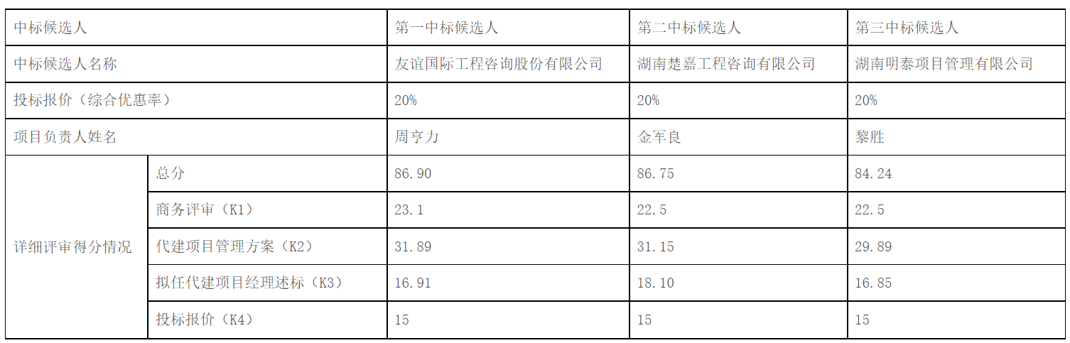 湖南天嘉项目管理有限公司受岳阳市工人文化宫的委托,对岳阳市工人文化宫二次装修及设备设施购置安装工程项目代建单位进行公开招标。招标全过程在岳阳市发展改革委(局)的监管下,于2024年01月16日09时30分(北京时间)在岳阳市公共资源交易中心经开标、评标,评标委员会按照招标文件规定的评标办法及原则进行评定,推荐中标候选人排名如下: