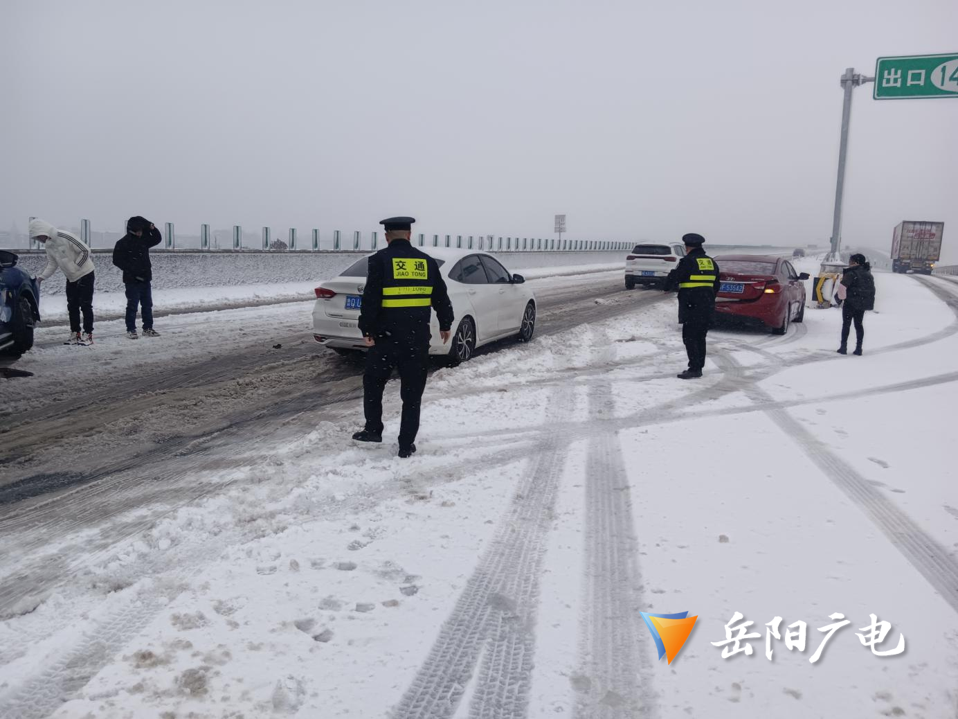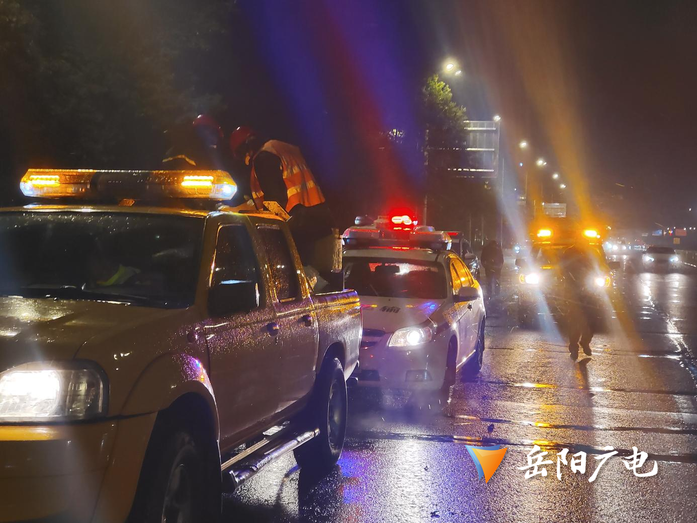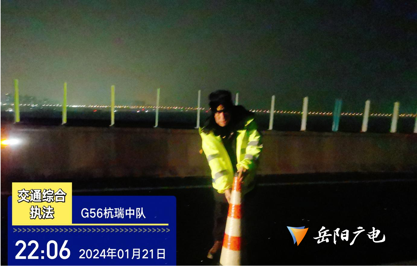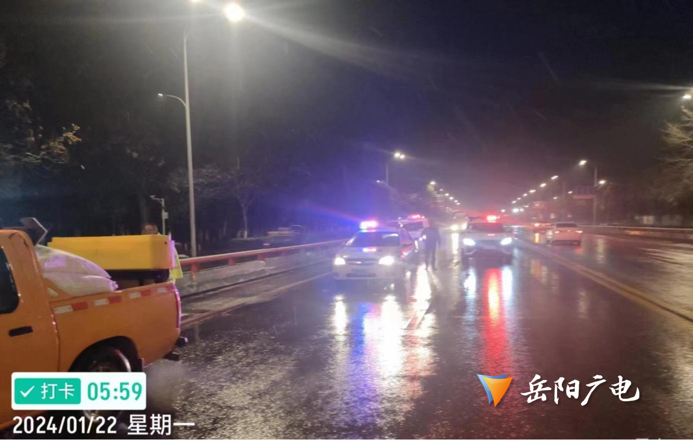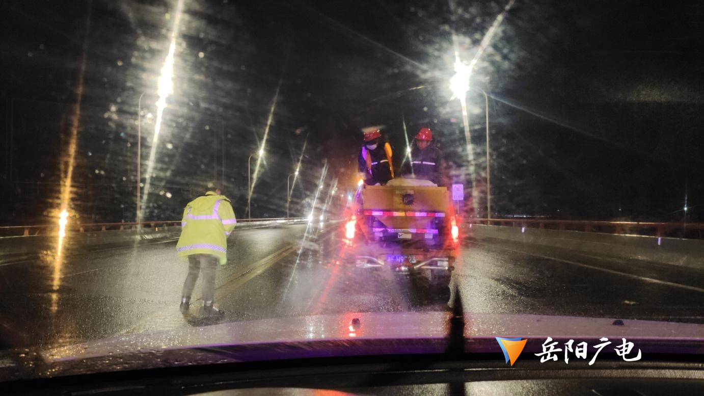 当晚,洞庭湖大桥上北风呼啸,雨雪落在大桥桥面上迅速结冰。为确保洞庭湖大桥安全畅通,支队公路路政执法大队联合洞庭湖大桥养护中心开展铲雪除冰、喷洒融雪剂等作业。执法人员不畏严寒、通宵作战,同时开启警灯闪烁提醒来往车辆缓慢通行,直到第二天早上7点,桥面车道上的冰雪完全融化,洞庭大桥没有发生一起因桥面结冰引起车辆打滑的交通事故。