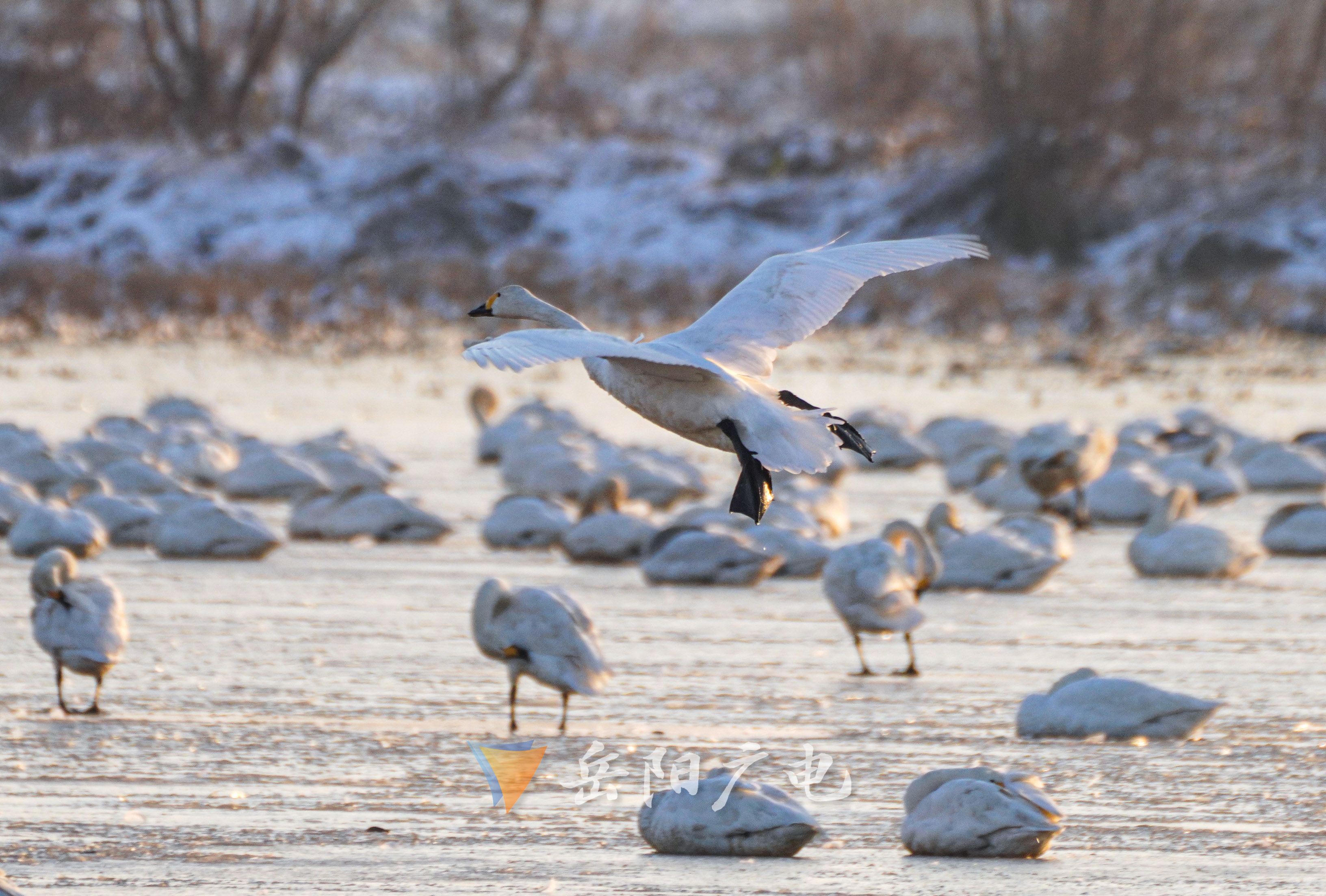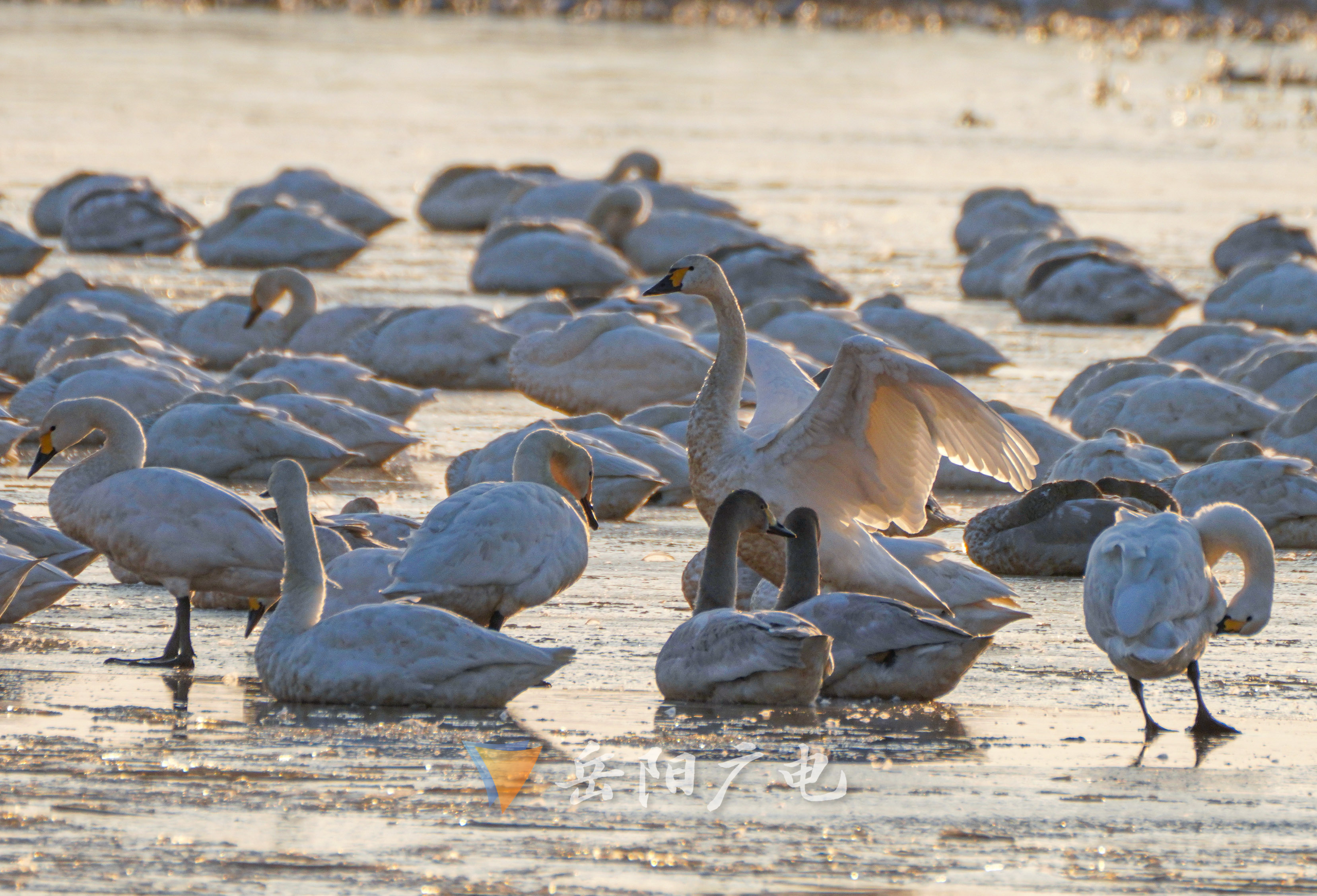 下雪了,小天鹅们在干什么呢?从昨天晚上开始,约2000多只小天鹅陆续栖息在东古湖,零下5-6度的低温,使东古湖水面结上厚厚的一层冰,当太阳开始升起的时候,一层金色的暖阳洒在湖面。小天鹅们大多数如没有睡醒一样,都将长长的脖颈插入翅膀深处,静静地享受时光带来的悠闲。慢慢地随着阳光的抬升,小天鹅便开始嬉闹活跃起来,有的一如晨起,认真梳理着毛发,有的慢悠悠地在破冰中游弋,有的伸长脖子宣示着自己的地盘,偶尔也来一场争斗,还有顽皮的小天鹅走在冰面,一不留神滑到,远处飞来的小天鹅降落时还会滑落重心不稳。整个东古湖尽管保持着往日的喧嚣,但由于南方的冰冻,这里还在上演着各种滑稽版本的故事。看来,困难再大,难不倒小天鹅对东古湖的热爱。(通讯员:宋政军)
