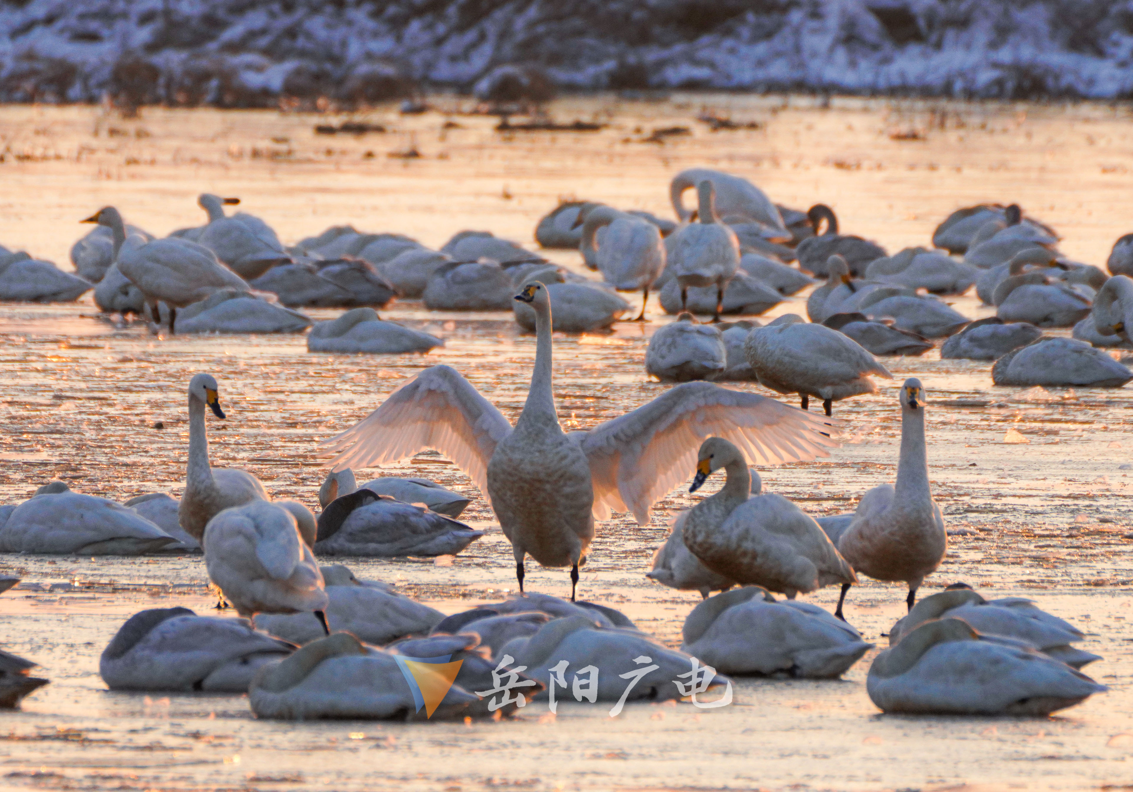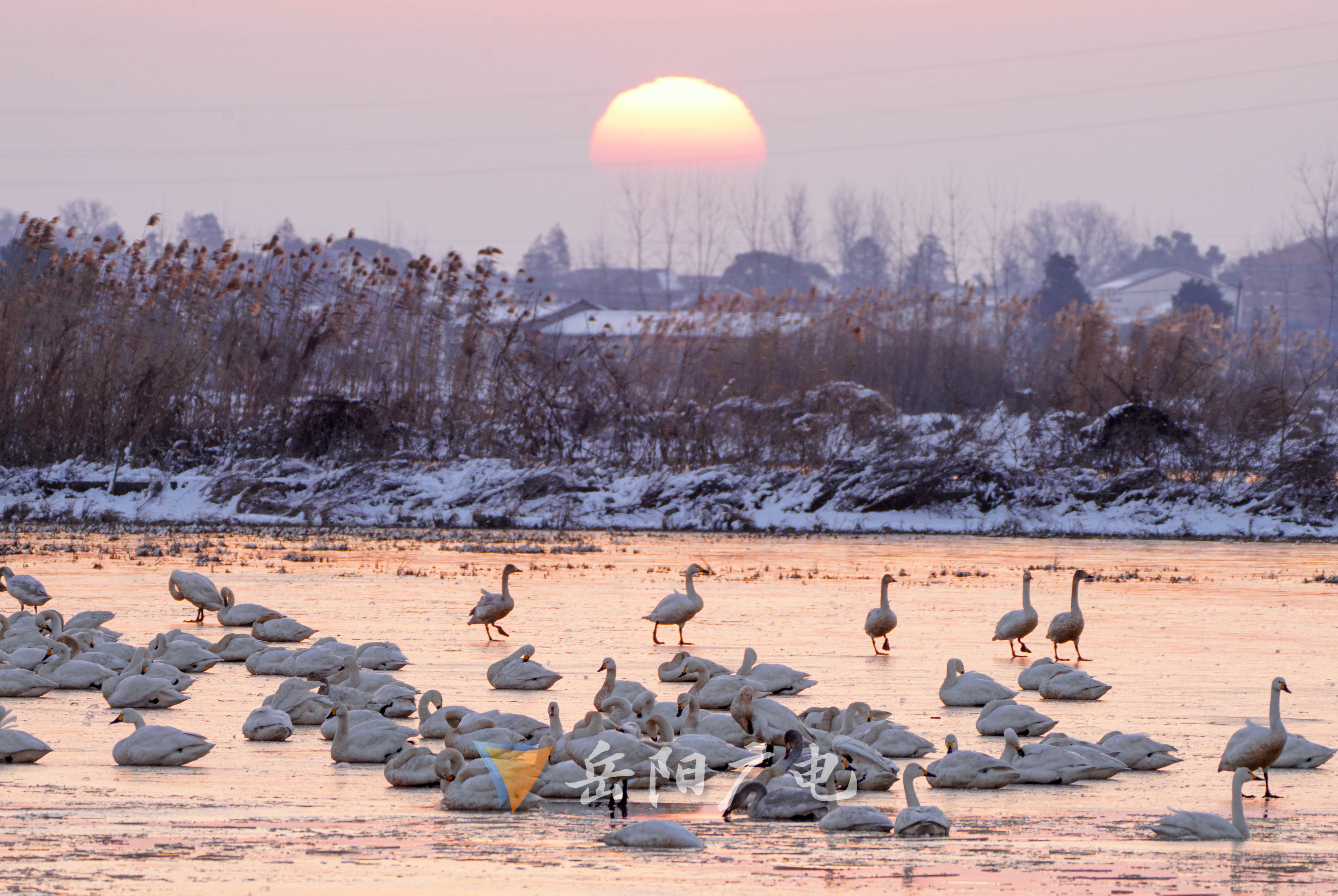 2024年的第一场雪,如期而至下到了湘北地区,屈原管理区全境被覆盖了厚厚的积雪。在经过一夜低温的冰冻后,1月23日清晨,东古湖拨开云雾,一轮红日喷薄而出。一如往常,西伯利亚小天鹅仍然留宿在东古湖,只是厚厚的冰层还是给小天鹅们带来一些困难。