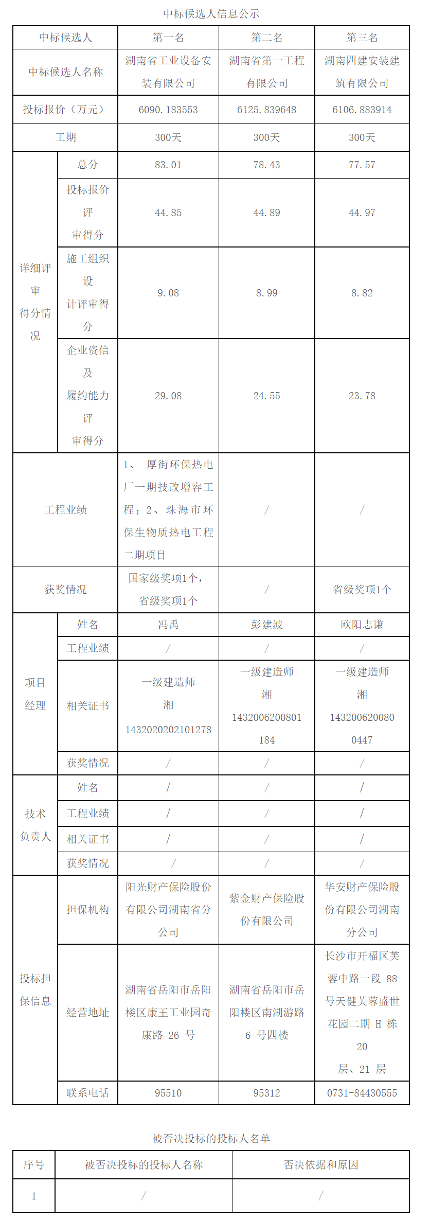 根据招标投标相关法律法规及招标文件的规定,平江县市政污泥与生活(餐厨)垃圾焚烧发电厂工程(设备安装工程)评标工作已经结束,本项目采用“综合评估法”的评标办法,评标委员会推荐了以下3名排序的中标候选人,现将相关信息予以公示。公示期2024年2月5日至2024年2月8日。
