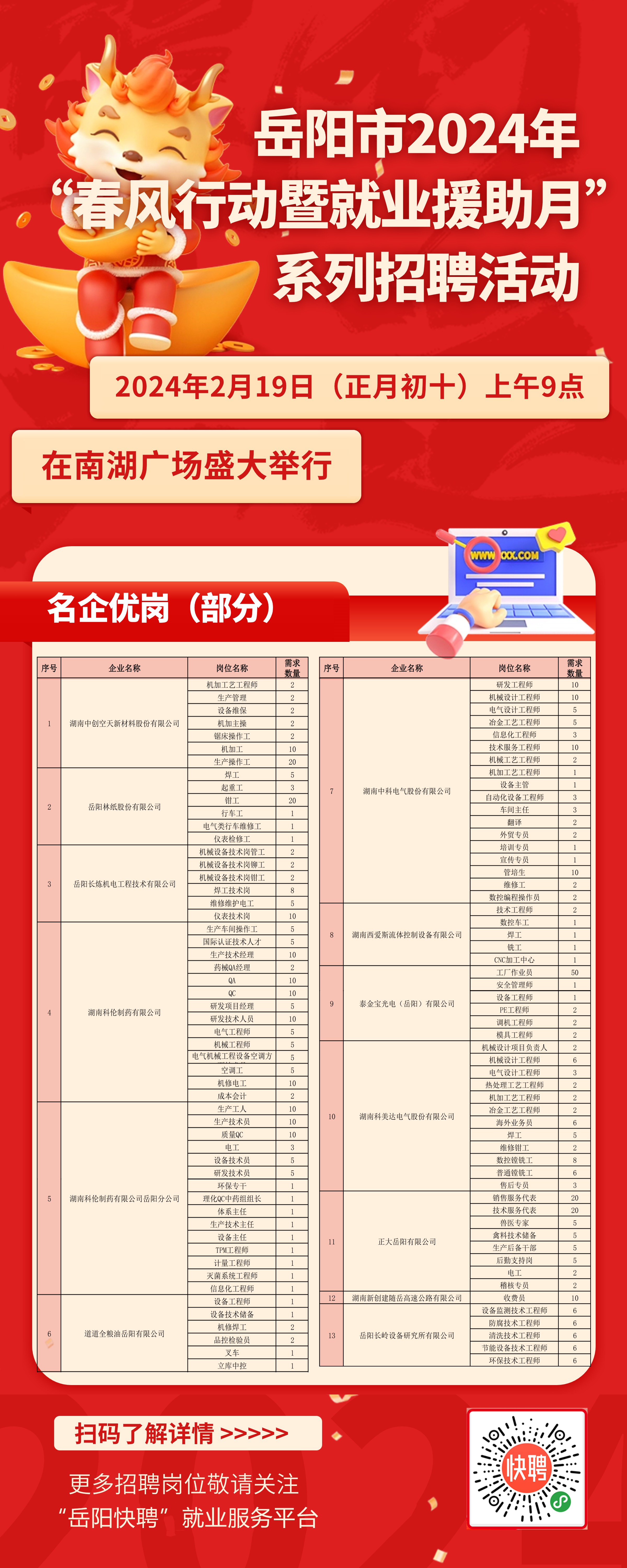 2月18日,记者从市人社局获悉,为深入贯彻落实国家、省、市关于稳就业工作的决策部署,市人社部门抢抓开工复市黄金期,将联合其他有关部门于2月19日(大年初十)上午在南湖广场启动2024年全市“春风行动暨就业援助月”系列招聘活动。