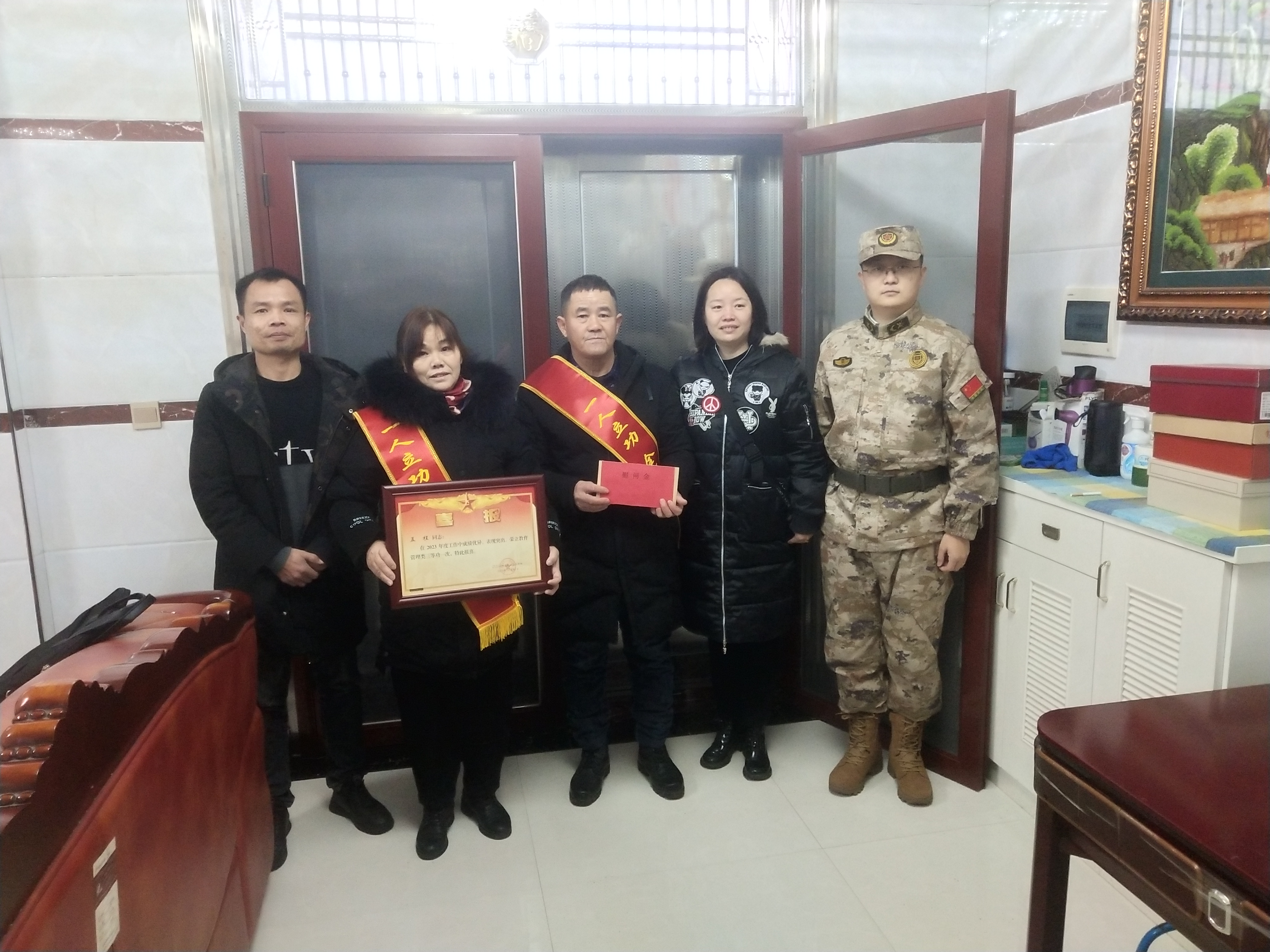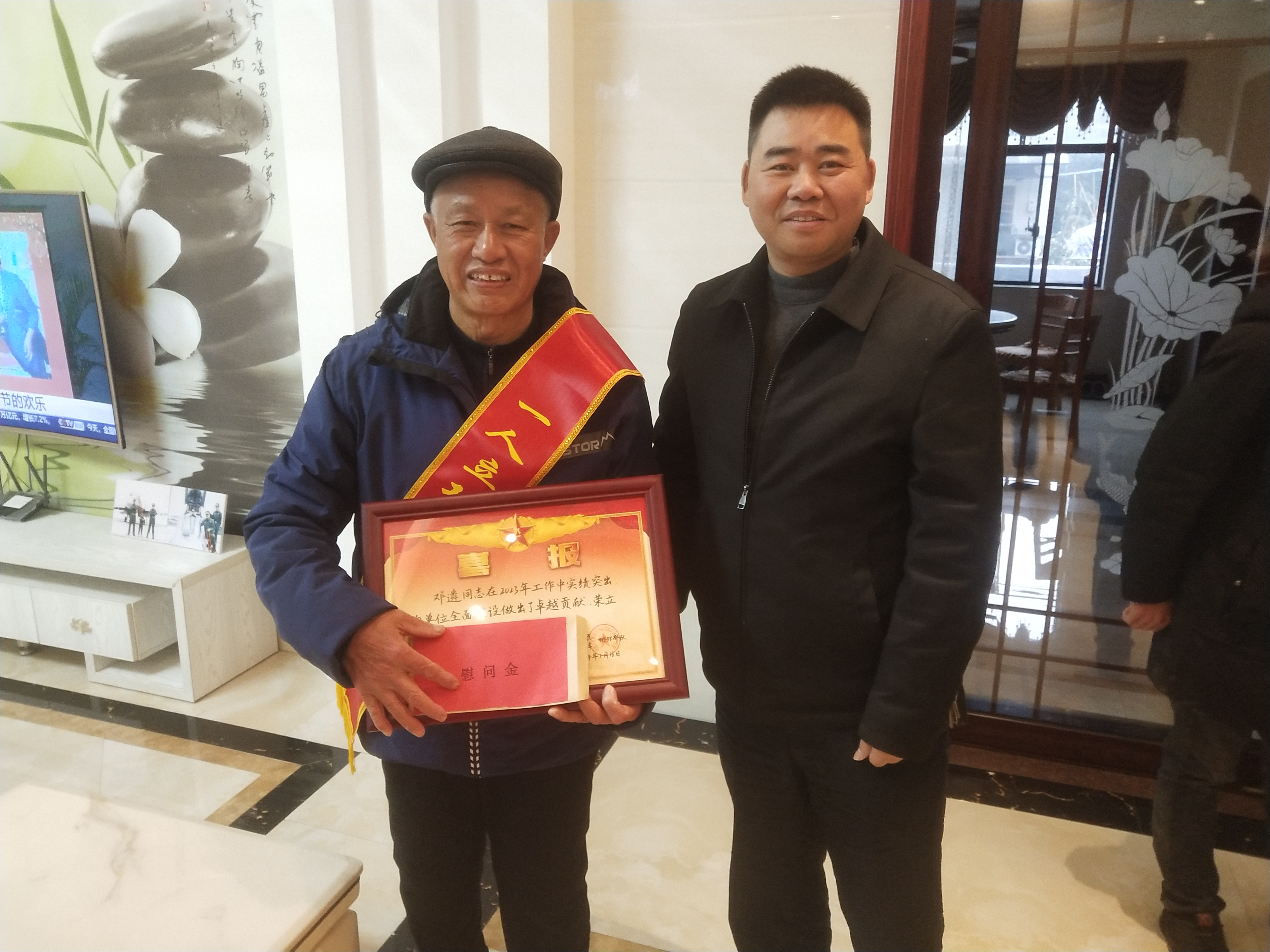 工作人员来到两位三等功臣家中,为其家属披上绶带,颁发三等功喜报并送上慰问金,感谢他们为部队培养输送了优秀人才。