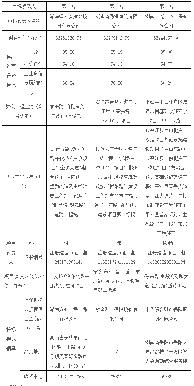 根据招标投标相关法律法规及招标文件的规定,汨罗高新区表面处理中心基础设施配套及雨污分流工程建设项目评标工作已经结束,本项目采用“综合评估法”的评标办法,评标委员会推荐了以下3名中标候选人(排序),现将相关信息予以公示。公示期2024年3月1日至2024年3月6日。