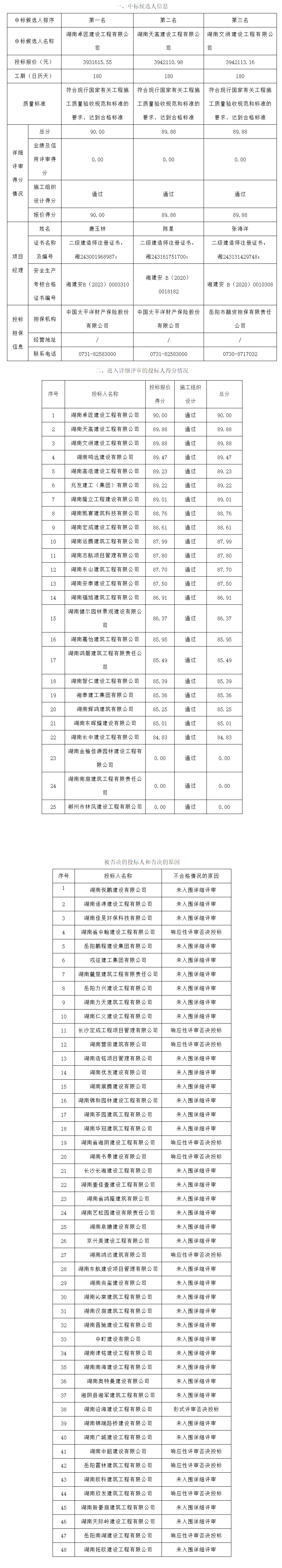 根据招标投标相关法律法规及招标文件的规定,湘阴县兴湘市场小区老旧小区改造配套基础设施建设项目(含兴湘市场小区和胜利小区)采用湘建监督〔2021〕107号文件规定的:经评审的最低投标价法的评标办法,评标工作于2024年4月22日已经结束,评标委员会推荐了以下3名中标候选人(排序),现将相关信息予以公示。公示期2024年4月24日至2024年4月26日。