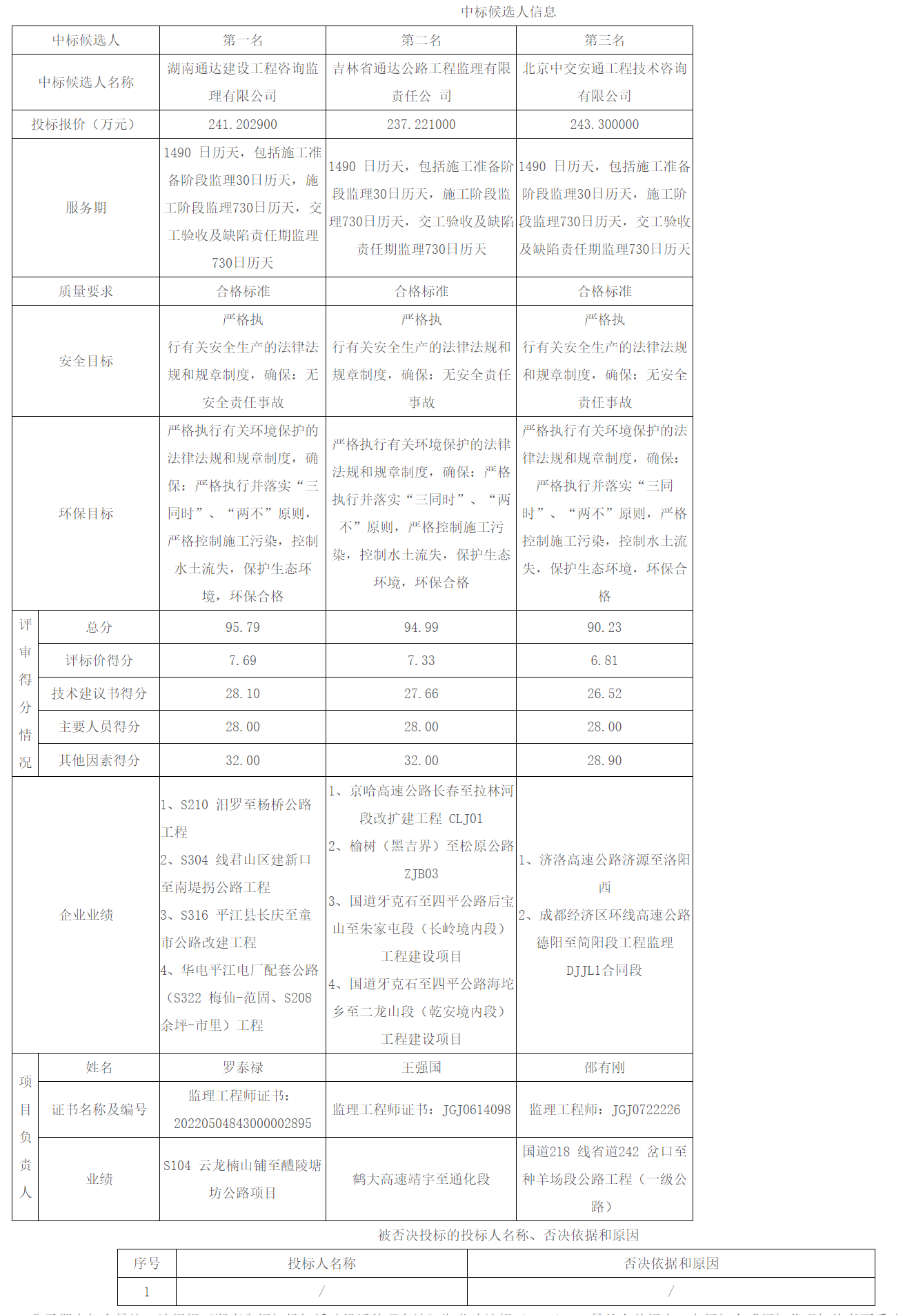 根据招标投标相关法律法规及招标文件的规定,S316平江县石牛寨至长庆公路改建工程(第二期)施工监理评标工作已经结束,本项目采用“综合评估法”的评标办法,评标委员会推荐了以下3名中标候选人(排序),现将相关信息予以公示。公示期2024年5月7日至2023年5月10日。