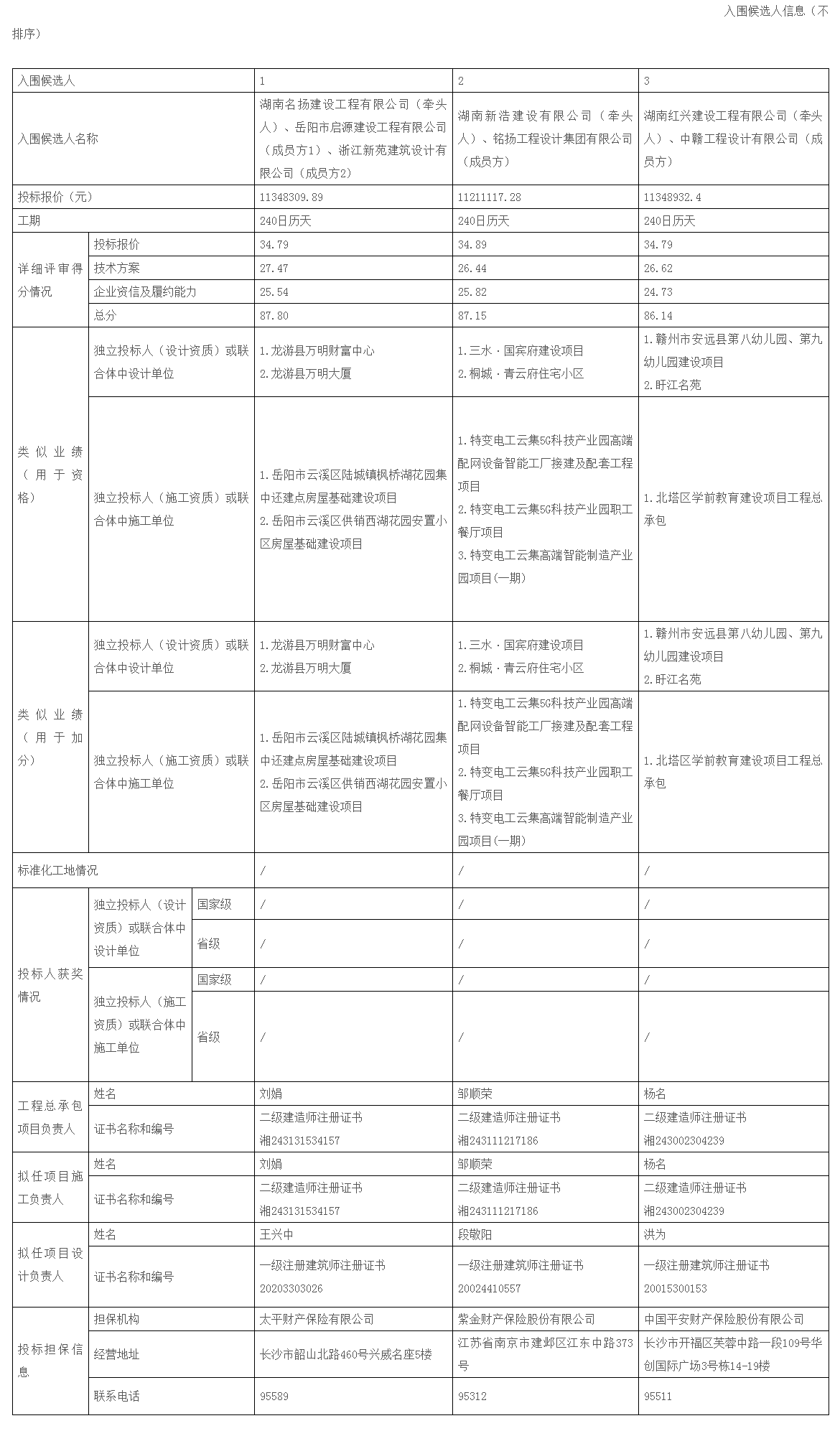 根据招标投标相关法律法规及招标文件的规定陆城镇枫桥湖保障性租赁住房建设项目评标工作已经结束,本项目评标办法采用湘建监督【2021】36号文件规定的“综合评估法”,评标委员会推荐了以下3名入围候选人(不排序),现将相关信息予以公示。公示期2024年5 月 15 日至2024年 5月20日。