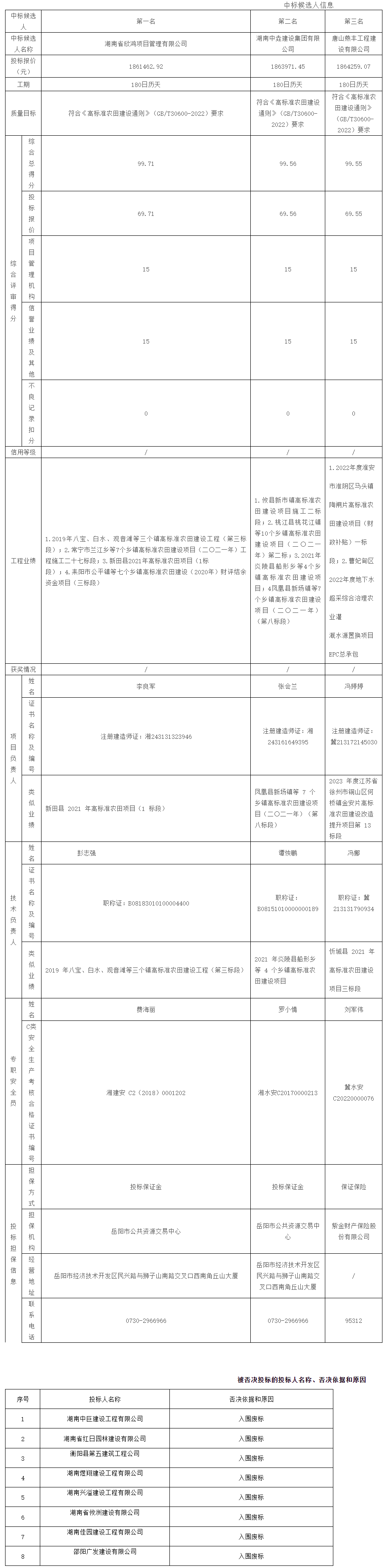湖南发平项目管理有限公司受岳阳市屈原管理区农业农村局的委托,代理湖南省岳阳市屈原管理区高标准农田建设项目(二0二四年新增建设、提质改造)第七标段工程施工招标,2024年5月16日(北京时间)在岳阳市公共资源交易中心进行了公开开标,在岳阳市农业农村局监督下,依法组建的评标委员会按照招标文件确定的评标原则和评标办法进行了细致的评审,并推荐本项目中标候选人排名如下: