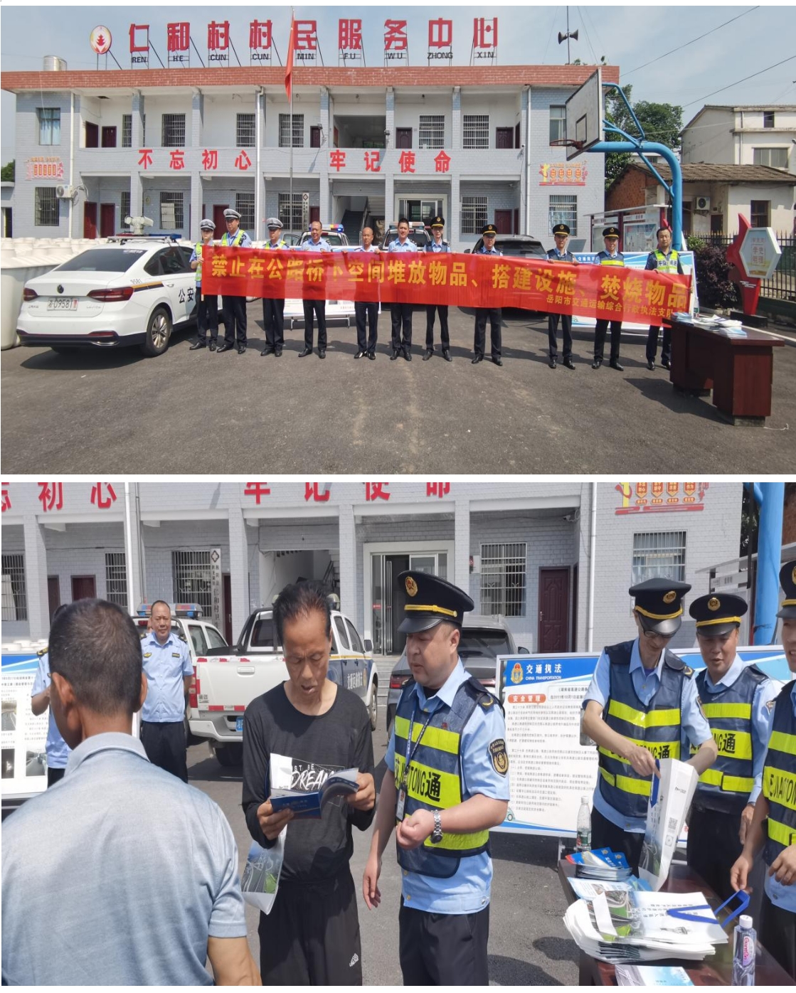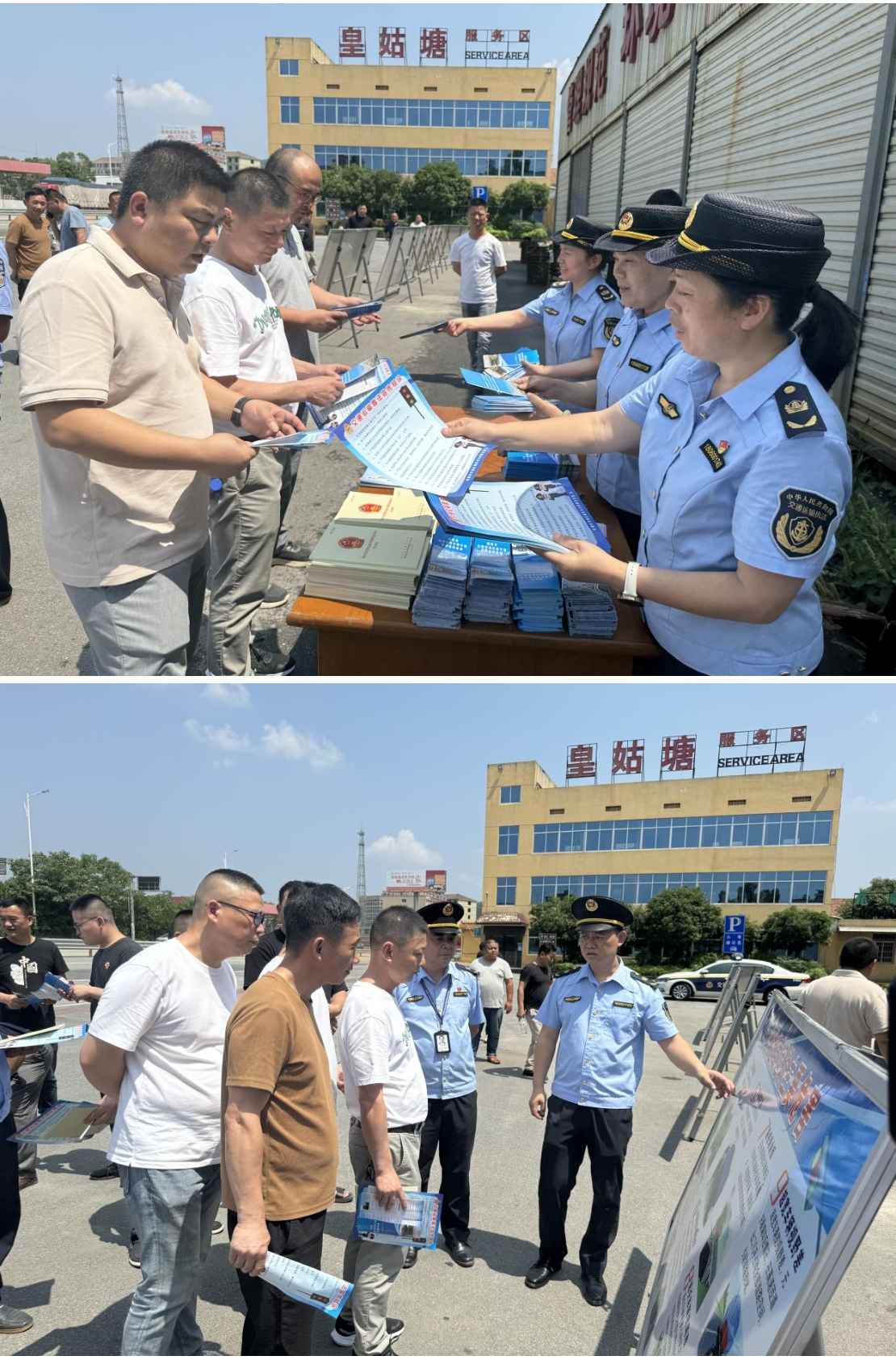 在许广高速岳阳服务区,一群司乘人员正在路政宣传展板旁驻足观看。支队高速公路执法大队执法人员给现场群众重点讲解公路附属设施保护、公路用地、公路建筑控制区、超限超载等法律条款及在高速公路桥下空间禁止堆放物品,乱搭乱建等。同时,执法人员深入高速公路沿线村组,通过悬挂宣传横幅、张贴宣传标语,向村民开展普法宣传。