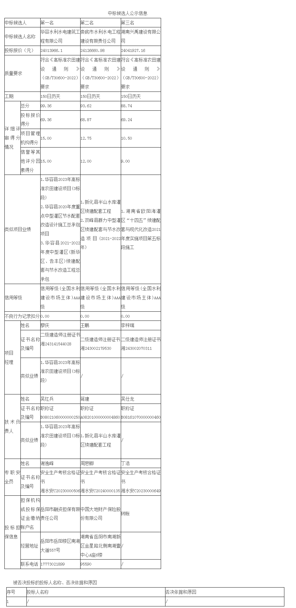 大华建设项目管理有限公司受华容县农业农村局的委托,代理华容县2024年高标准农田建设项目(2023年增发国债第一批项目)(二标段)工程施工招标,2024年5月27日(北京时间)在岳阳市公共资源交易中心进行了公开开标,在岳阳市农业农村局监督下,依法组建的评标委员会按照招标文件确定的评标原则和评标办法进行了细致的评审,并推荐本项目中标候选人(排序)排名如下: