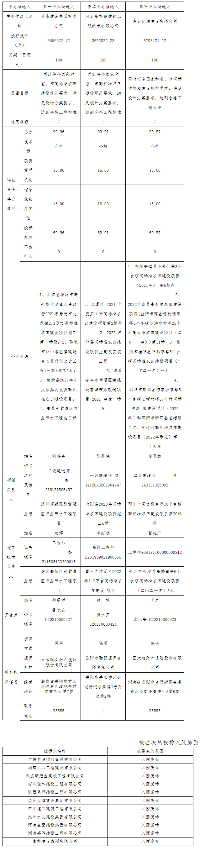 湖南兴和招标有限责任公司受岳阳经济技术开发区农村工作部的委托,代理湖南省岳阳经济技术开发区高标准农田建设项目第一标段招标,2024年5月27日09时30分(北京时间)在岳阳市公共资源交易中心进行了公开开标,在岳阳市农业农村局下,依法组建的评标委员会按照招标文件确定的评标原则和评标办法进行了细致的评审,并推荐本项目中标候选人排名如下:
