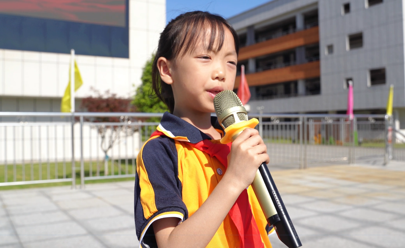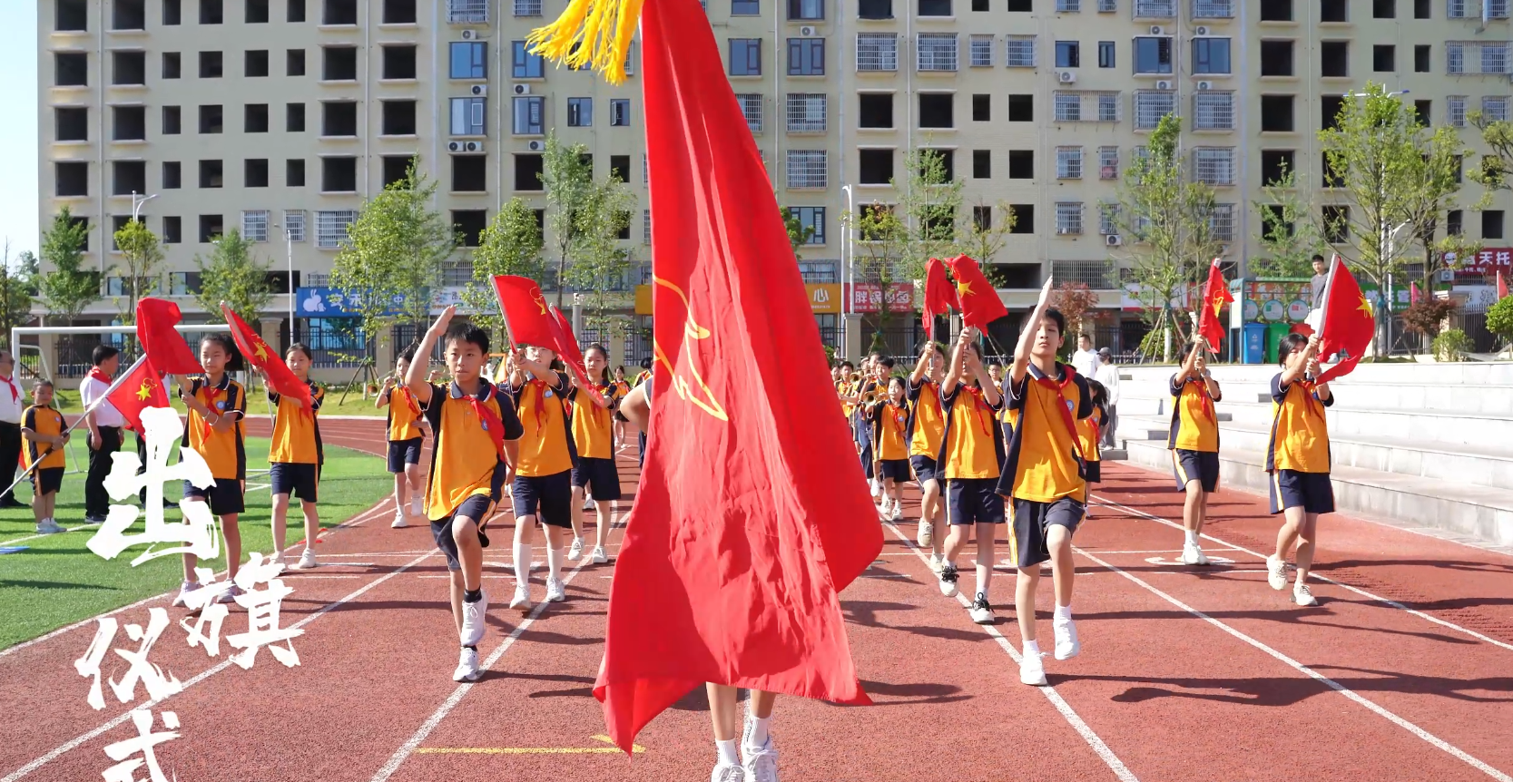 伴随着庄严的《出旗曲》,旗手和护旗手高举少先队旗,迈着整齐划一的步伐,拉开了入队仪式的序幕。少先队员们庄严迎旗,唱响中国少年先锋队队歌《我们是共产主义接班人》。