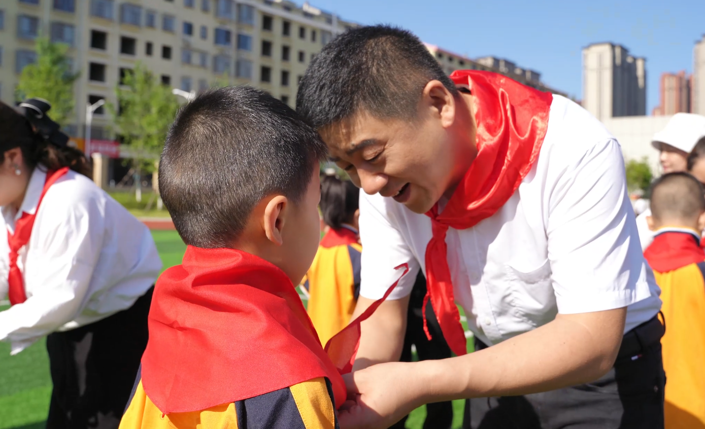 老师代表和老少先队员们一起为新少先队员佩戴鲜艳的红领巾,并轻轻地整理好。