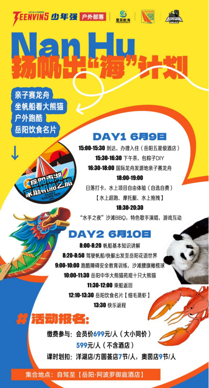 活动内容:将于国际龙舟赛发源地南湖举办亲子龙舟赛,游客可以体验南湖丰富的水上运动项目,参观憨态可掬的熊猫,品鉴烧烤、小龙虾等岳阳特色美食,还有沙滩BBQ、沙滩橄榄球等精彩活动,这个端午,到南湖水上运动中心一起扬帆出“海”。