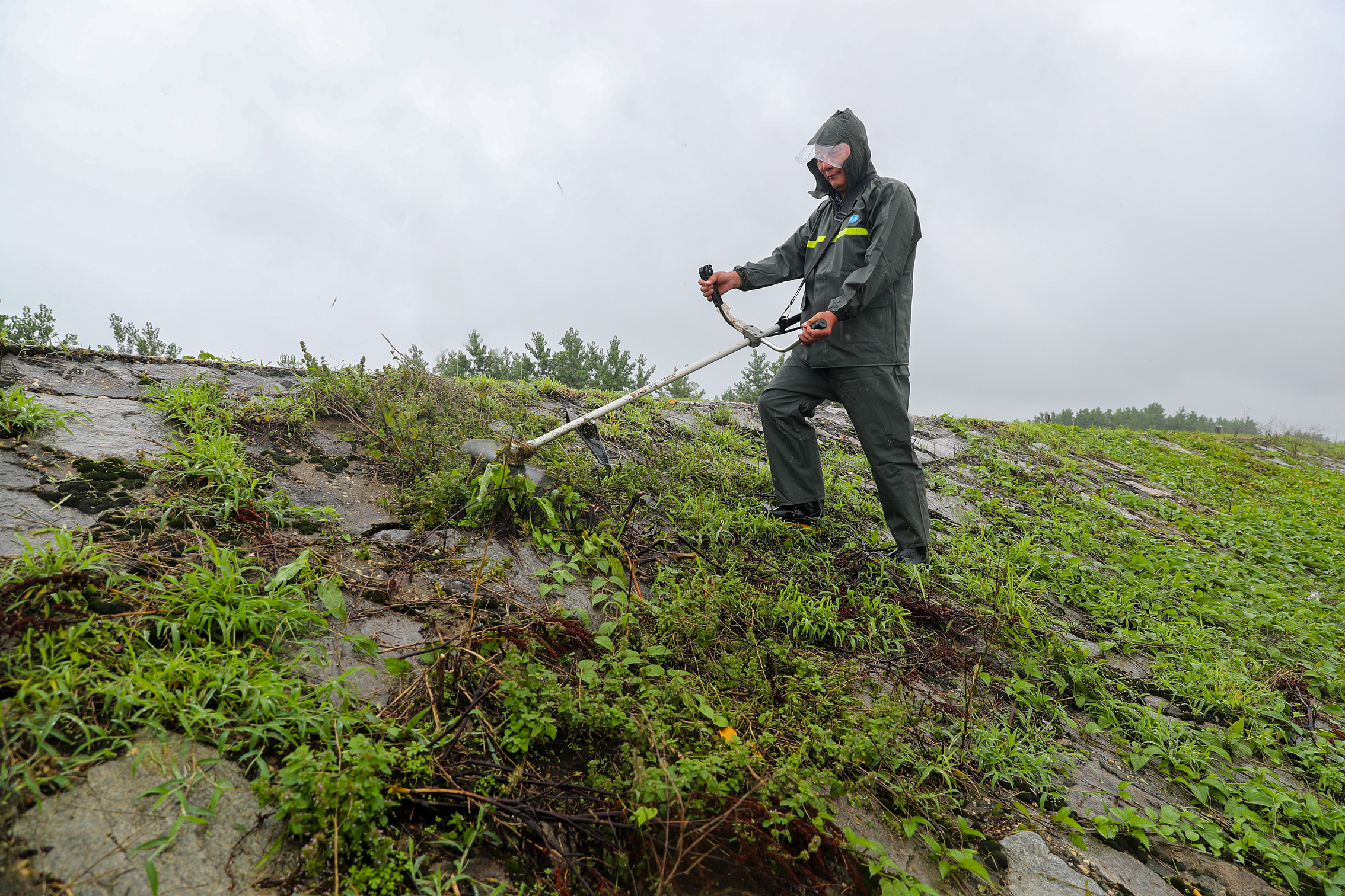 屈原融媒记者看到,在屈原管理区凤凰乡青港村防汛堤段,虽然雨下的很大,但防汛人脚步不停,身着雨衣手拿割草机正对沿线大堤进行清基扫障。