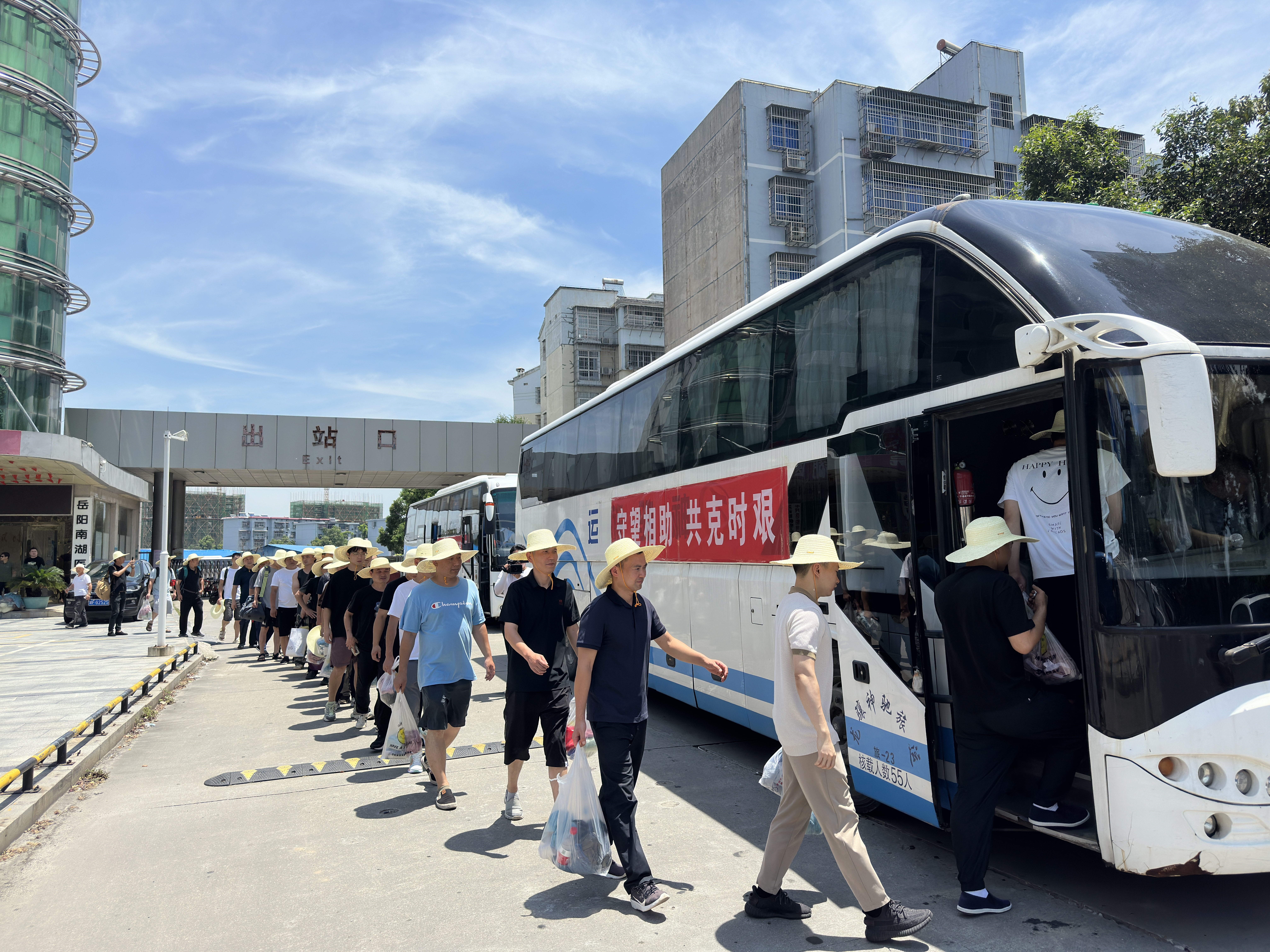 11时40分,洞庭汽车站人流络绎不绝,来自岳阳楼区郭镇乡、奇家岭街道、三眼桥街道、王家河街道、洛王街道、区退役军人事务局志愿者们提着分发的一条毛巾、一套洗漱用品,戴着一顶草帽,登上大巴车正式向君山钱团间堤出发。