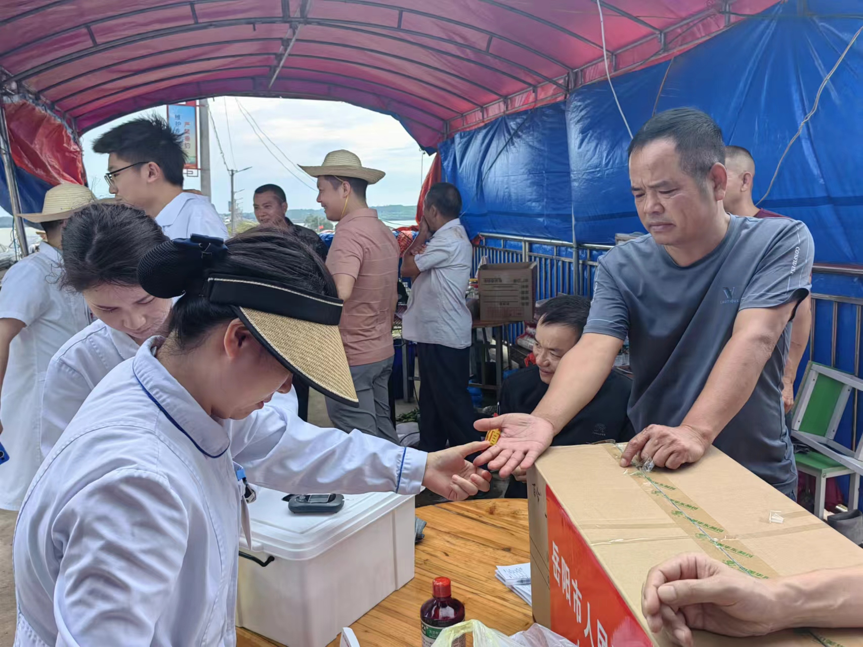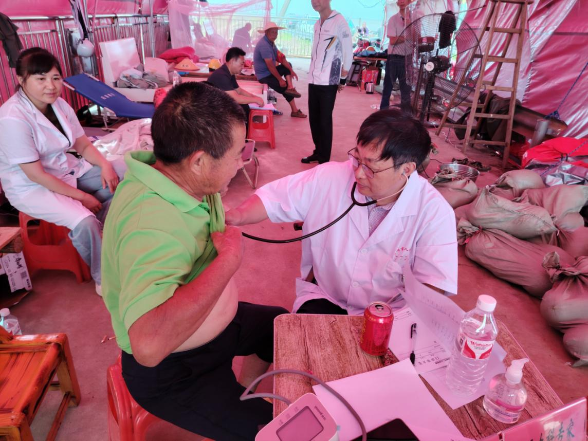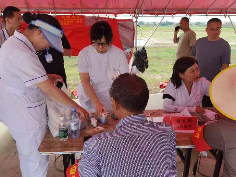 上午,由市卫健委牵头,医院15名医疗队员带着防暑药品来到岳阳县中洲垸大堤。15名医务人员分别驻扎在岳阳县机场村、北垸村及平江河村三个棚点,为抗洪一线人员进行健康体检和诊治。