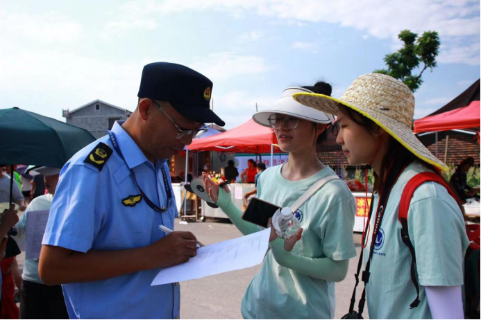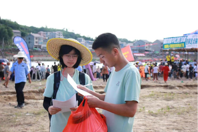 本次麻阳龙舟比赛虽然吸引了许多外地游客,但是参加比赛的大多都是当地村民,由于语言壁垒,导致外地游客不能深刻体会了解麻阳龙舟比赛背后的文化和精神。因此,实践团肩负着一项特殊的任务——在热闹非凡的龙舟比赛中,化身“翻译官”向工作人员和赛事观众推广普通话,此外,实践团还与村民深入交流,挖掘麻阳龙舟精神的具体含义和背后的动人故事,成员们认真聆听,详细记录,并将这些故事用流利的普通话向外地游客娓娓道来。这促进当地居民与外地游客之间的有效沟通。