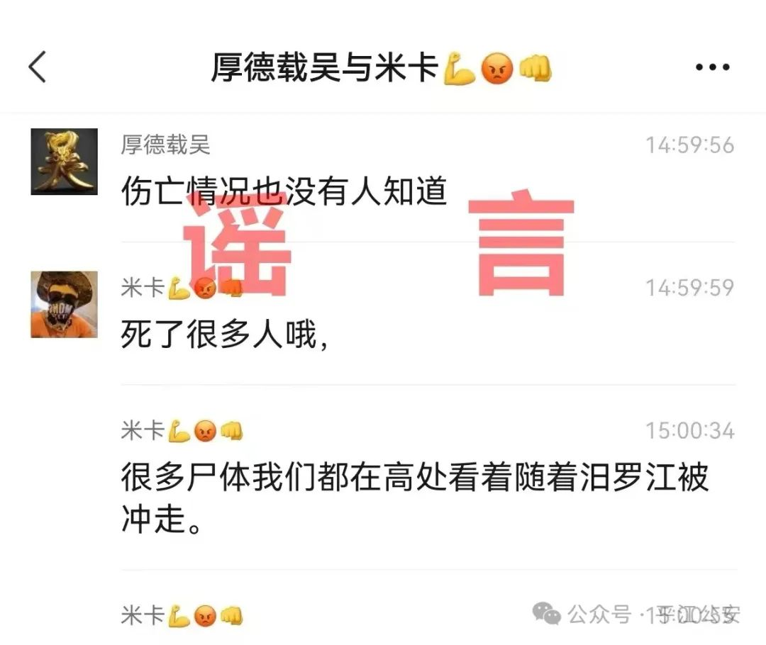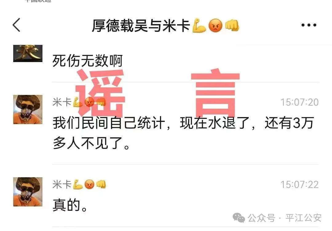 2024年7月6日,网络平台出现一聊天截图谎称“很多尸体我们在高处看着随着汨罗江被冲走,有3万多人不见了”,被大量转载,造成恶劣影响。经查,相关不实言论系微信昵称为“米卡”的网民毛某某为图一时“口嗨”发给其微信好友。7月8日,网民毛某某对其散布网络谣言、故意扰乱公共秩序的违法行为供认不讳,平江公安机关依法对其采取行政处罚措施。