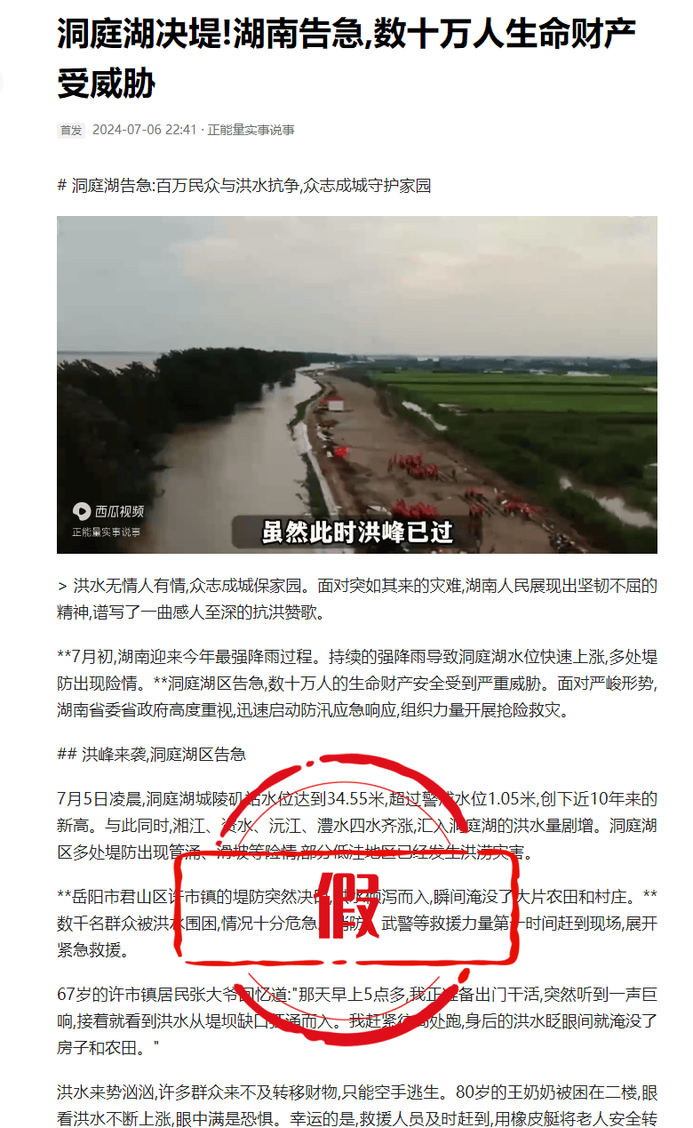 2024年7月1日,账号“正能***说事”在某社交平台发布文章《洞庭湖决堤!湖南告急,数十万人生命财产受威胁》,谎称“岳阳市君山区许市镇的堤防突然决口,洪水倾泻而入,瞬间淹没了大片农田和村庄,数千名群众被洪水围困,情况十分危急。消防、武警等救援力量第一时间赶到现场,展开紧急救援。”经核实,岳阳市君山区许市镇堤防并未发生决口,帖文内容与事实严重不符,网信部门已对该不实信息进行辟谣。