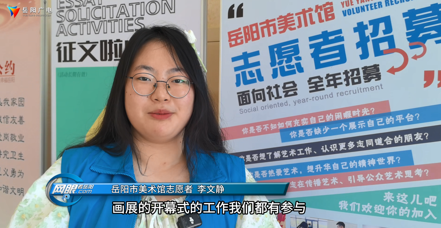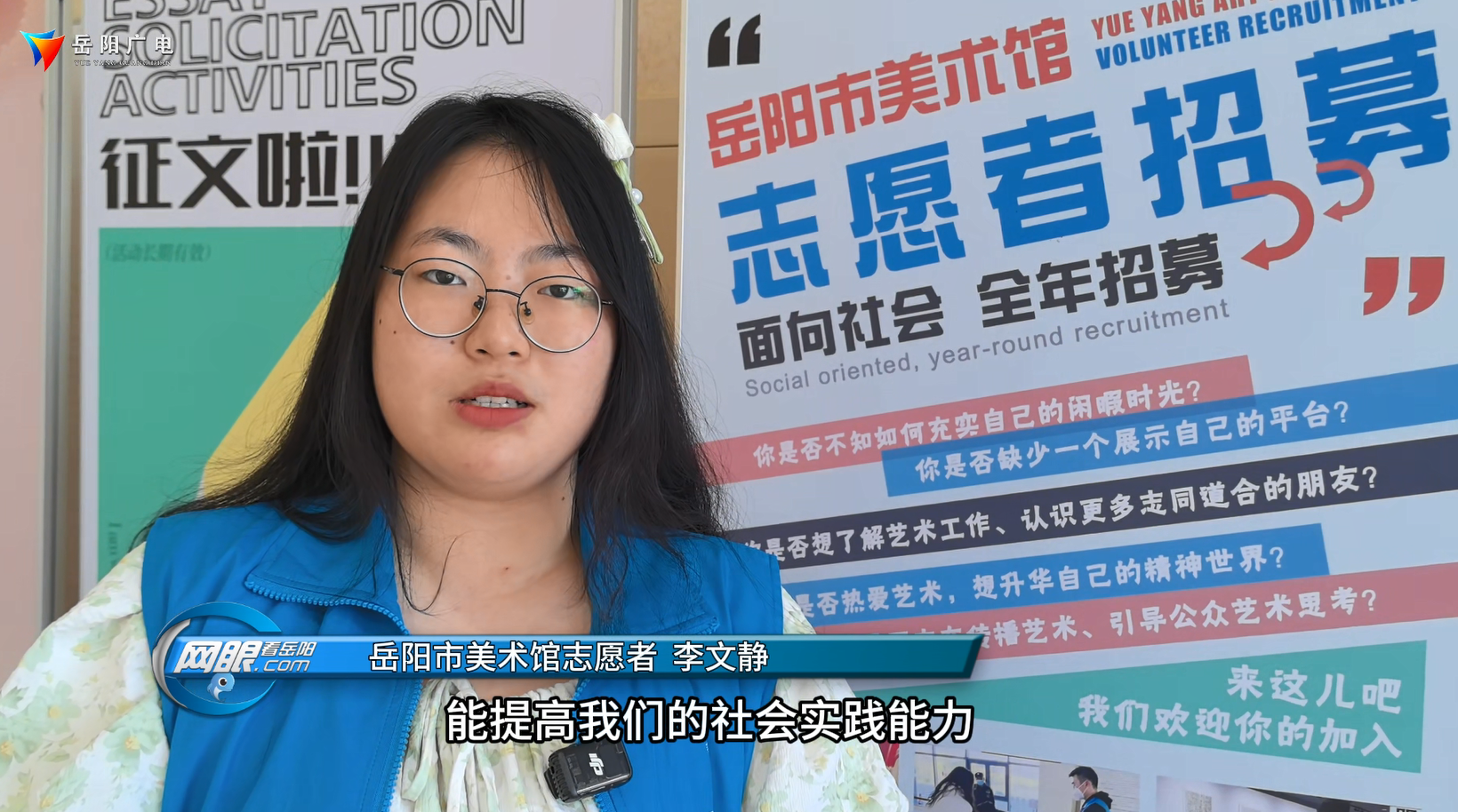 岳阳市美术馆志愿者 李文静:因为我觉得参与志愿者服务活动,作为大学生能提高我们的社会实践能力,让我们更好地更早地接触社会,然后积极地融入到这个社会。