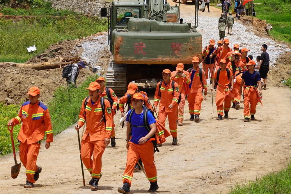 向更深处行进。一路上,记者不时看到赶路的武警、消防等救援力量。由于主干道被巨石、泥沙、树枝等杂物阻拦,他们只好穿行在山林中、农田里,鞋子裹着泥土,浑身被汗水浸透。