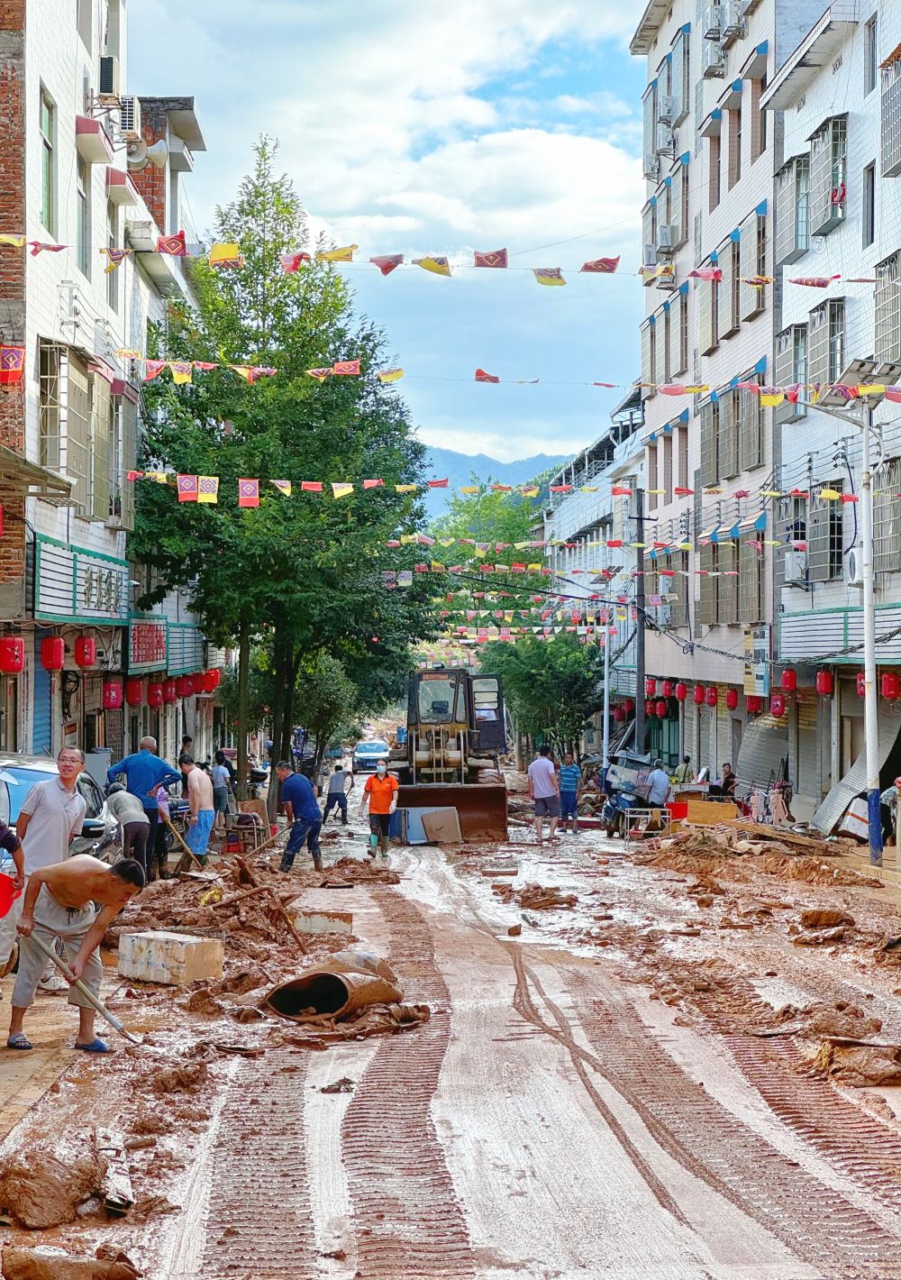 下午4时许,经过6个小时的挺进,记者进入八面山瑶族乡集镇。洪水肆虐过后,多条街道堆积起厚厚的淤泥和垃圾,当地正组织开展清淤工作。装载机、货车的轰鸣声,志愿者们手持铁铲铲过地面的响声,此起彼伏。