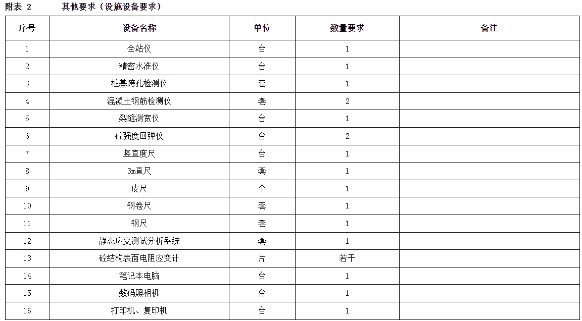 注:1表所列仪器设备清单为最低要求,有经验的投标人可依据本项目实际情况和招标文件工地实验室的要求,配备所需的试验、检测、测量仪器、交通设施及办公设备,以充分满足检测工作的需要,并说明租赁与新购的初步落实程度。