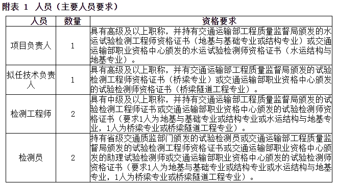 (1)具有高级及以上职称,并持有交通运输部工程质量监督局颁发的水运试验检测工程师资格证书(地基与基础专业或结构专业)或交通运输部职业资格中心颁发的水运试验检测师资格证书(水运结构与地基专业);