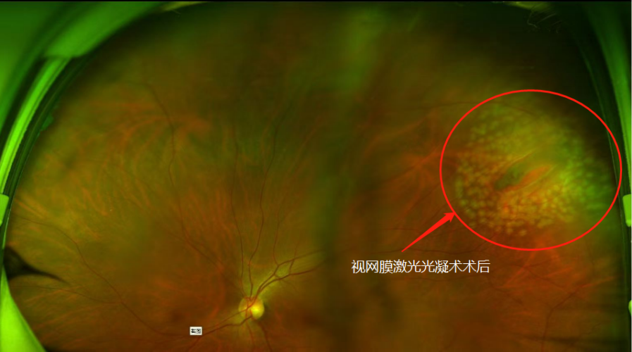66岁的严先生得知眼底竟然有裂孔,十分惊讶:“眼睛也不红肿,也不痛,半个月前感觉左眼前面隐约有黑色的影子,起初以为是没休息好,这两天感觉黑影也越来越大,还是有点慌了”。刘祥明主任详细检查后发现严先生左眼视网膜上有个“洞”,这个洞在医学上称为视网膜裂孔,并已经伴随有左眼孔源性视网膜脱离(孔周浅脱离),建议进行视网膜激光光凝术进行治疗。