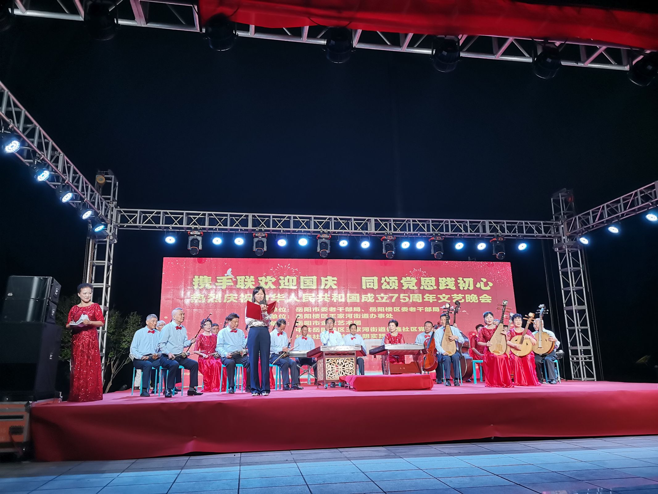 岳阳市委老干部局在国庆节前夕组织送文化进社区文艺晚会,旨在为国庆增添浓厚喜庆氛围,活跃群众文化生活,不断激发社区居民的爱国热情和文化自信,促推形成大力弘扬民族精神、时代精神和爱国主义精神的良好风气。