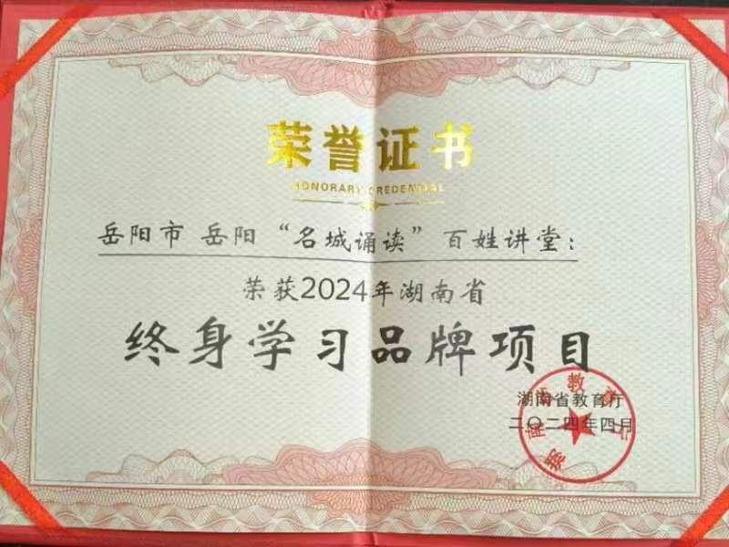 10月11日晚,由岳阳市人民政府主办、岳阳市教育体育局承办的“2024年岳阳市全民终身学习活动周开幕式,在南湖广场隆重举行。开幕式上,岳阳名城诵读百姓讲堂负责人魏诗琪走上领奖台,从市政协副主席、市教体局副局长万五龙手中接过了省教育厅颁发的荣誉证书,证书内容为"岳阳名城诵读百姓讲堂荣获2024年湖南省终身学习品牌项目”。