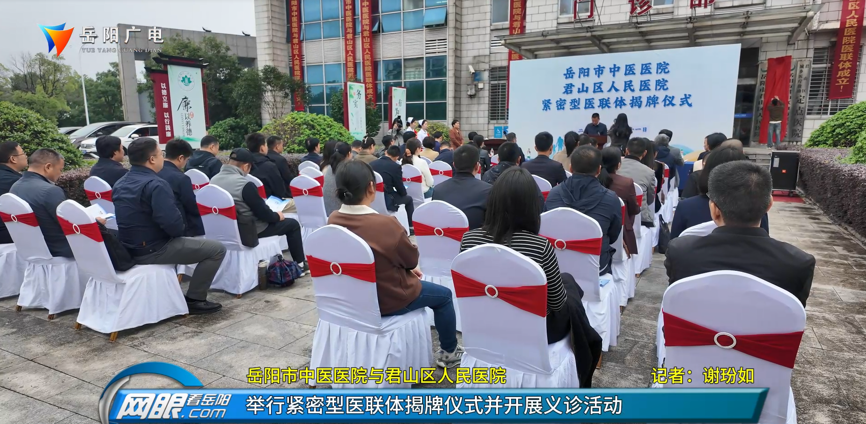 仪式上,市卫健委党组书记、主任余岳雄,君山区委副书记、区长陈淼,市中医医院党委副书记、院长黎珊, 君山区人民医院党委书记王威共同为紧密型医联体揭牌。